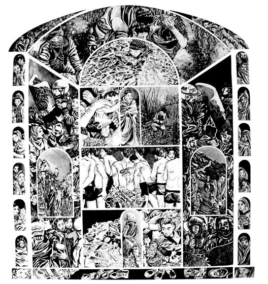 initiée il y a trois ans, constitue quant à elle mon plus grand projet en taille-douce. Elle vise à questionner et réinvestir des images religieuses sous une lumière athée et reprend la forme du retable pré-Renaissance, car, au-delà de la mise en regard avec un discours religieux, celui-ci offre la possibilité d’une narration contemporaine laïque, par juxtaposition des formes, des points de vue et des images. Alors que la première pièce de cette série s’était intéressée à la vision chrétienne de l’Enfer, la deuxième, intitulée La Fuite, reprend plutôt le récit théologique de l’exode hors d’Égypte. Car si, aujourd’hui, des peuples entiers entreprennent réellement un voyage pour fuir les souffrances, la mer ne s’ouvre pas pour les laisser passer, elle engloutit les corps. Le voyage des migrants d’aujourd’hui est une même errance à travers les monts et les déserts, mais la terre promise n’est plus qu’un mirage. L’Europe, destination fantasmée, se dérobe et l’esclavage, à l’origine du départ mythique du peuple juif, est souvent la seule perspective pour l’exilé subsaharien contemporain. Cette gravure retrace deux histoires, deux trajets présentés en miroir : à droite, la fuite du migrant du MoyenOrient ou de l’Asie centrale, à gauche, celle du migrant africain. L’un et l’autre sont unis par une même réalité, l’épreuve du voyage (au centre) et un même rêve d’une Europe accueillante mais dont la réalité s’avère bien plus amère.