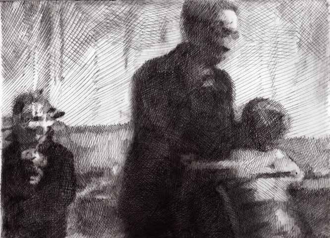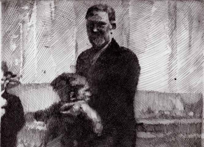Page 47 : Cuando las palabras ardan en la chimenea, extrait d’une série de trois impressions, pointe sèche sur plexiglas, 40 × 60 cm, papier Munken Lynx Rough 240 g et chine collé sur Fabriano ;