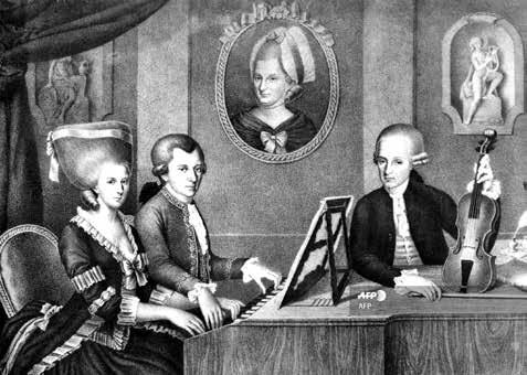Tablou nedatat, reprezentîndu-l pe Wolfgang Amadeus Mozart (în centru), cîntînd la clavecin alături de sora și tatăl său, Leopold Mozart