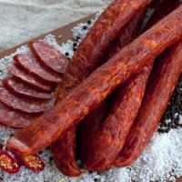 Ingredients: beef and sheep meat with a special mix of garlic, salt, black pepper, hot chili pepper & sweet paprika powder, thyme, peppers. The products are made with natural membranes.