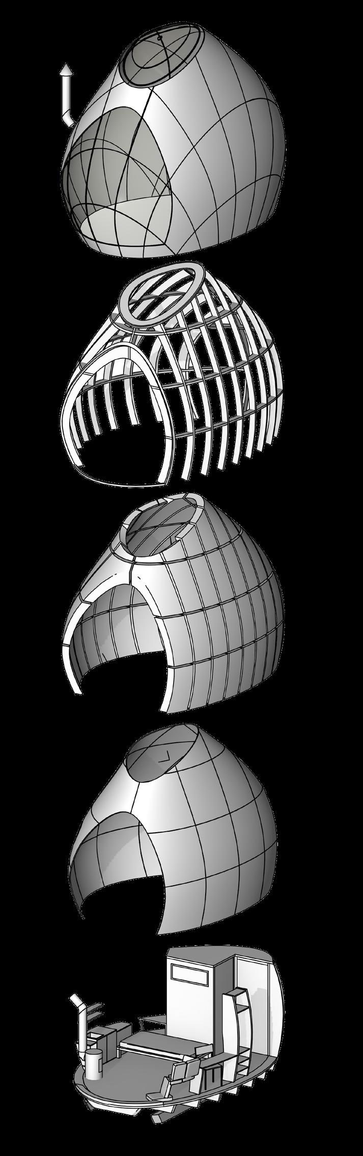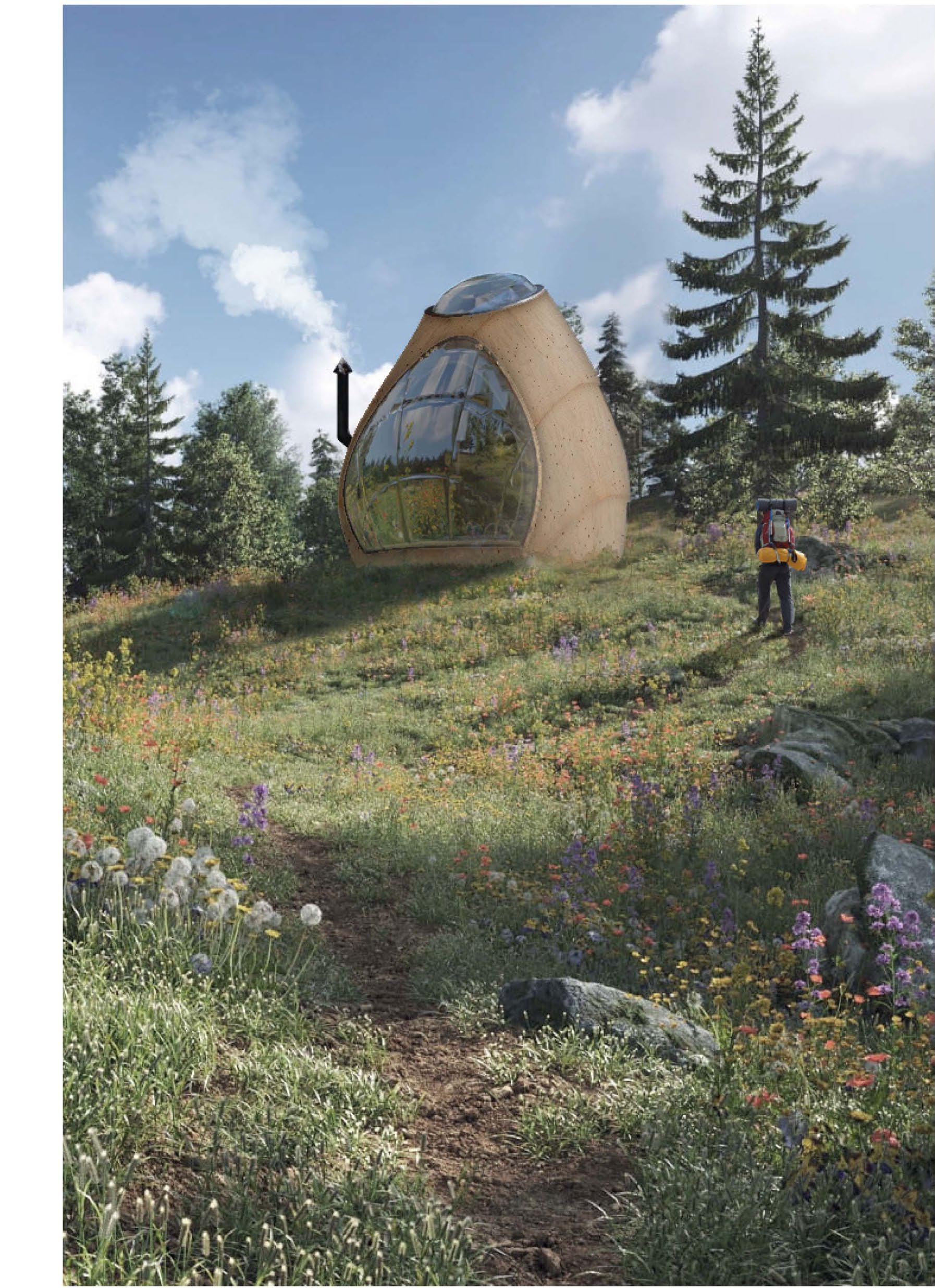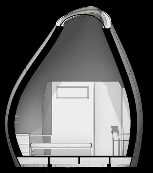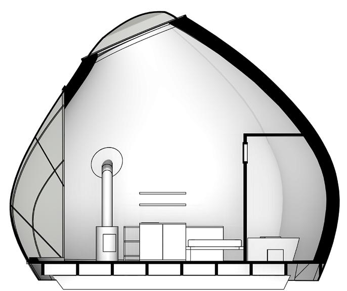 Accommodating one person for a stay of a few days, the structure includes basic elements of comfort following the contest’s specifications. The large curved polycarbonate wall connects the occupant to the surrounding nature by erasing the boundary between the indoor / outdoor space, thus promoting a contemplative and meditative state.