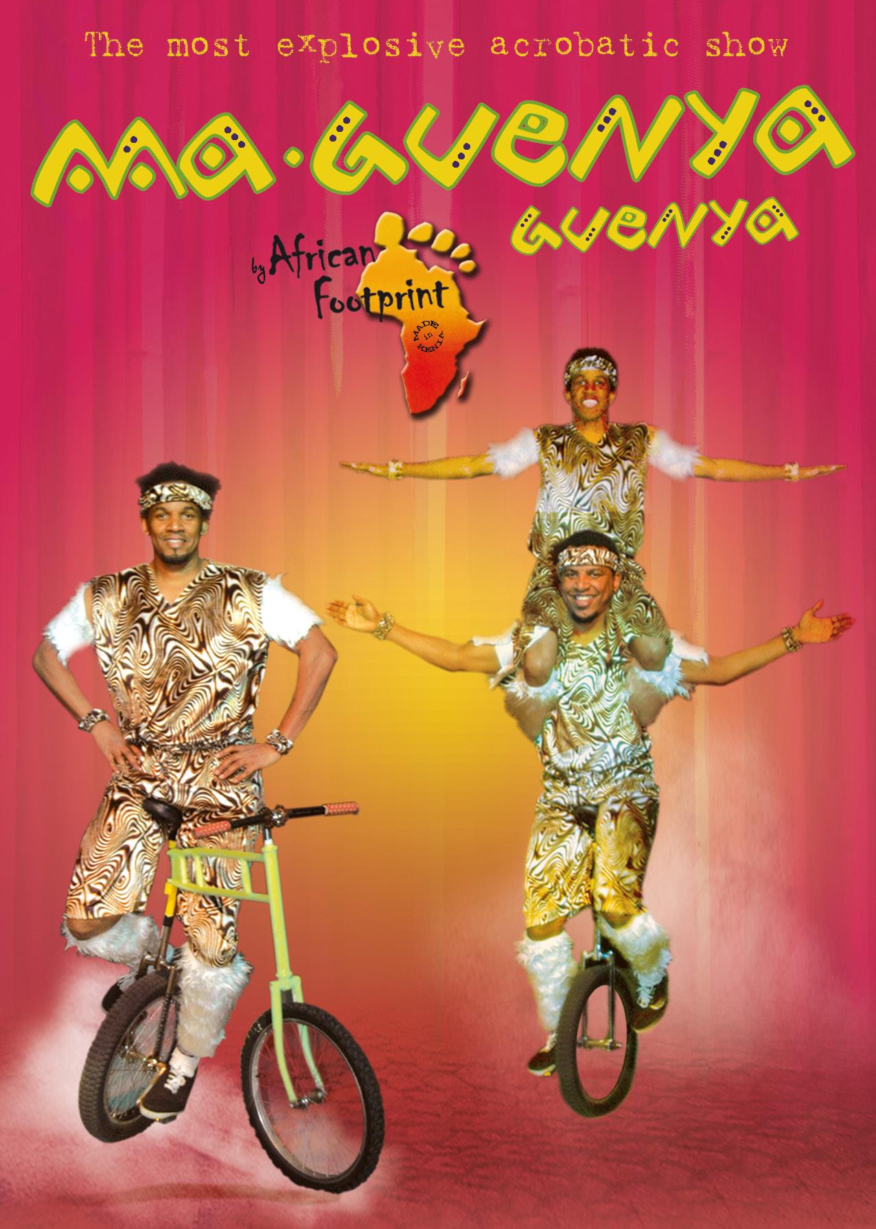 MA·GUENYA GUENYA by African Footprint le aseguran una maravillosa mezcla entre actos africanos tradicionales y de estilo occidental, todos ellos envueltos entre artes circenses que han ido adquiriendo y perfeccionando con los años, siempre bajo una visión puramente africana. Nuestro espectáculo esta basado en actos de mucha energía, rápidos, con fuerza y llenos de humor e ingenio, ideal para entretener a todo tipo de público, en especial al familiar.