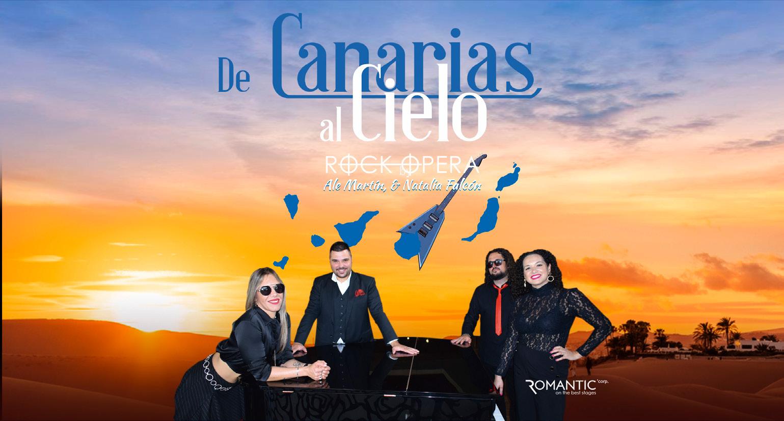 ‘De Canarias al Cielo’ es un homenaje a los grandes compositores e interpretes de la música canaria, tales como Alfredo Kraus o Los Sabandeños, entre otros, pasando por los grandes de lírica mundial como Bochelli, Luciano Pavarotti... Todos ellos fusionados con magníficos temas del rock femenino bajo la colaboración especial de Natalia Falcón y su portentosa aportación al show.
