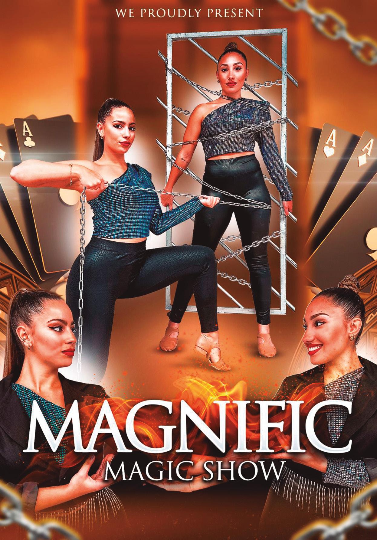Welcome to the Magnificent magic show, where the elegance of the two magicians merges with surprise in a truly unique experience. On stage, two talented female artists will guide you through a world of illusion and wonder, combining classic magic with the grace of acrobatics and flexibility.