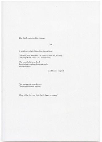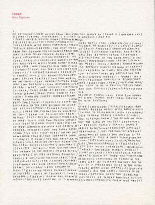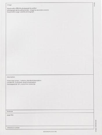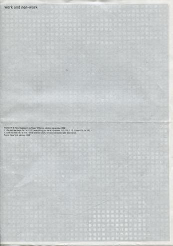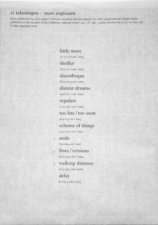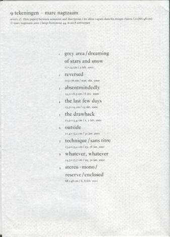 First Roma publication with handwritten text fragments and a series of drawings by Nagtzaam. Published in an edition of 200 copies as an autonomous contribution to an exhibition with nominees for the Prix de Rome, a prestigious art prize in the Netherlands. Besides combining the Ro and Ma of our names, the Prix de Rome was the second reason to put in the colophon that this was ROMA Publication #1. Soon after Mark Manders joined the team and from then Roma Publications become a series.