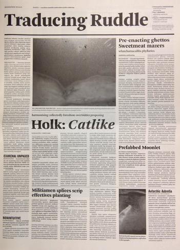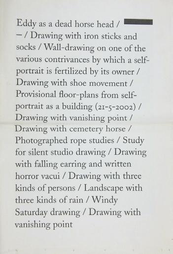 Newspaper with a collection of drawings by Mark Manders. The titels of the twenty drawings are put on the frontpage like headlines. Printed in New York on the occasion of Manders’ first gallery exhibition in the US at GreenNaftali.