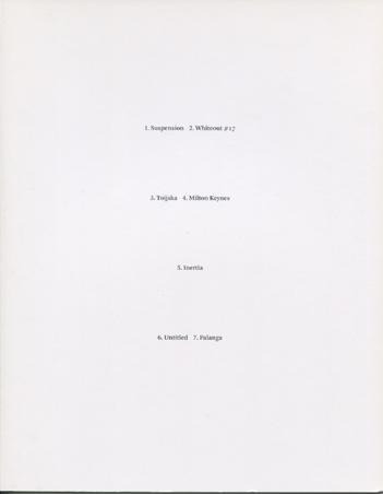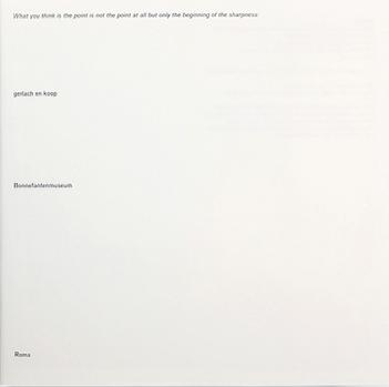 First Roma publication made with Mark Manders. The book contains a number of possible titles that Manders invented for works or installations that do not yet exist. One of those titles has been developed into a series of twelve color photographs showing a complex installation: a colored room with a black-and-white scene. A sequel coming out of this conceptual book was China (ROMA 24).