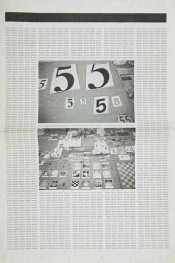 This poster with fives, the first one in a series of five, was made in the context of the exhibition 3 Räume 3 Flüsse, a public art project in Germany, curated by Jan Hoet and Philippe Van Cauteren. Manders and Willems stayed in the provincial town Hann. Münden for 5 days where they conceived a number of publications and intervetions in which the number 5 played a central role.