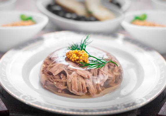 ears, and even hooves), then chicken is added to make a soup that chills into a jelly-like texture. Also known as Aspic, it predates Jell-O by several decades. The meat broth thickens when it cools into a not so appetizingly looking lump of jelly. The polish version is called Zimne Nóżki.