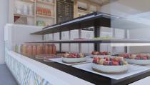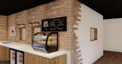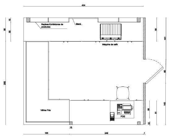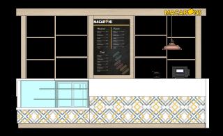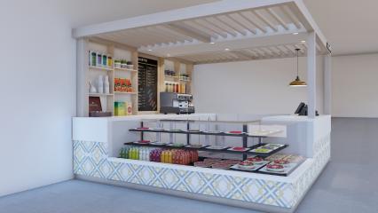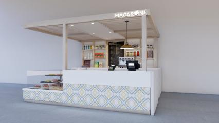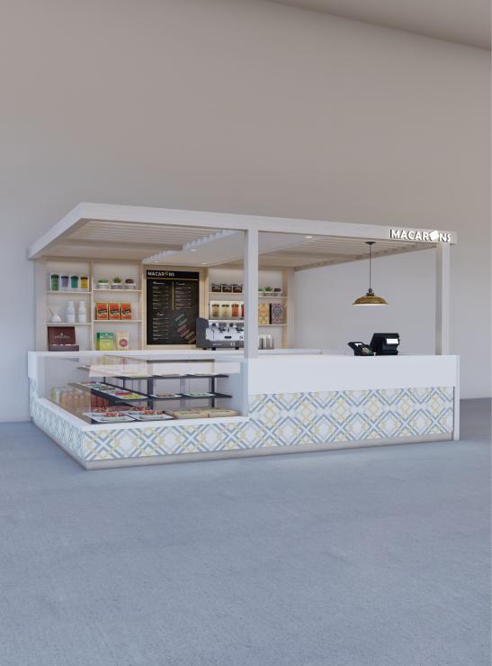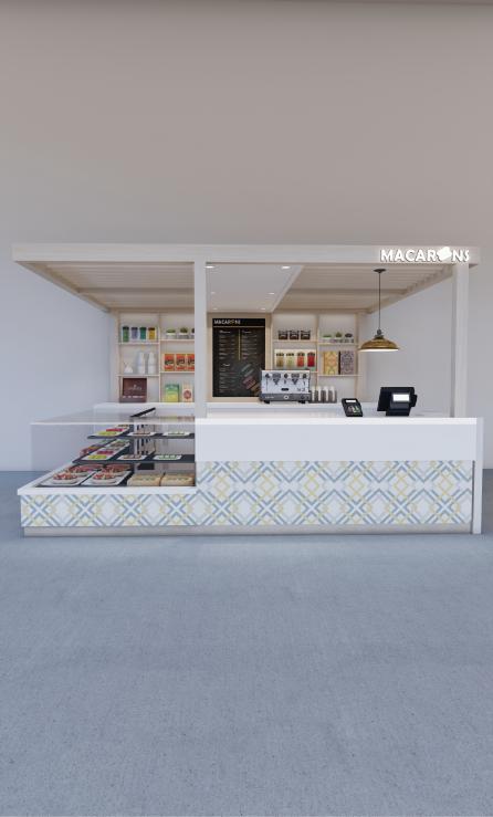 Punto de venta compacto, equipado con lo necesario para tipo de venta caliente e impulsiva. Su especialidad será el café junto con postres como macarrones, pasteles y jugos naturales.