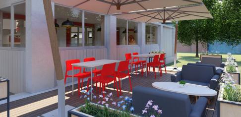 En este casino se utilizó mesas altas para darle más dinamismo a los espacios para los comensales, como también un sector de terraza con el mismo fin.