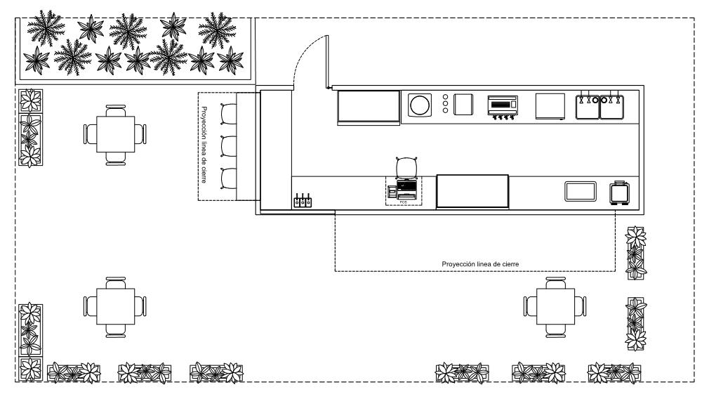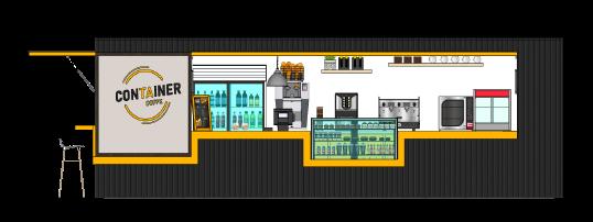 Al ser un container diseñado específicamente para uso de cafetería, cuenta con las conexiones adecuadas para su funcionamiento apropiado, entrada y salida por la parte posterior, dos aberturas en el frontis, por la cuales se encuentra la venta y entrega de productos