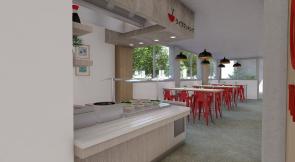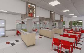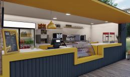 Cafetería modular ficticia, diseñada para estar en lugares con alta afluencia de público, como por ejemplo centro comerciales, aeropuerto, terminales de buses, entre otros.