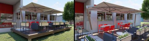 Cuenta con un mobiliario de alto tráfico, acorde a la línea de diseño de la cafetería modular. Además, posee unos separadores con flores para embellecer el espacio para que los comensales se sientan a gusto en el lugar. Las tonalidades usadas son negro, blanco y amarillo, los cuales se complementan para destacar a la cafetería y su mobiliario como tal. Se complementó con maderas oscuras para continuar con la línea del diseño generando una armonía en este.