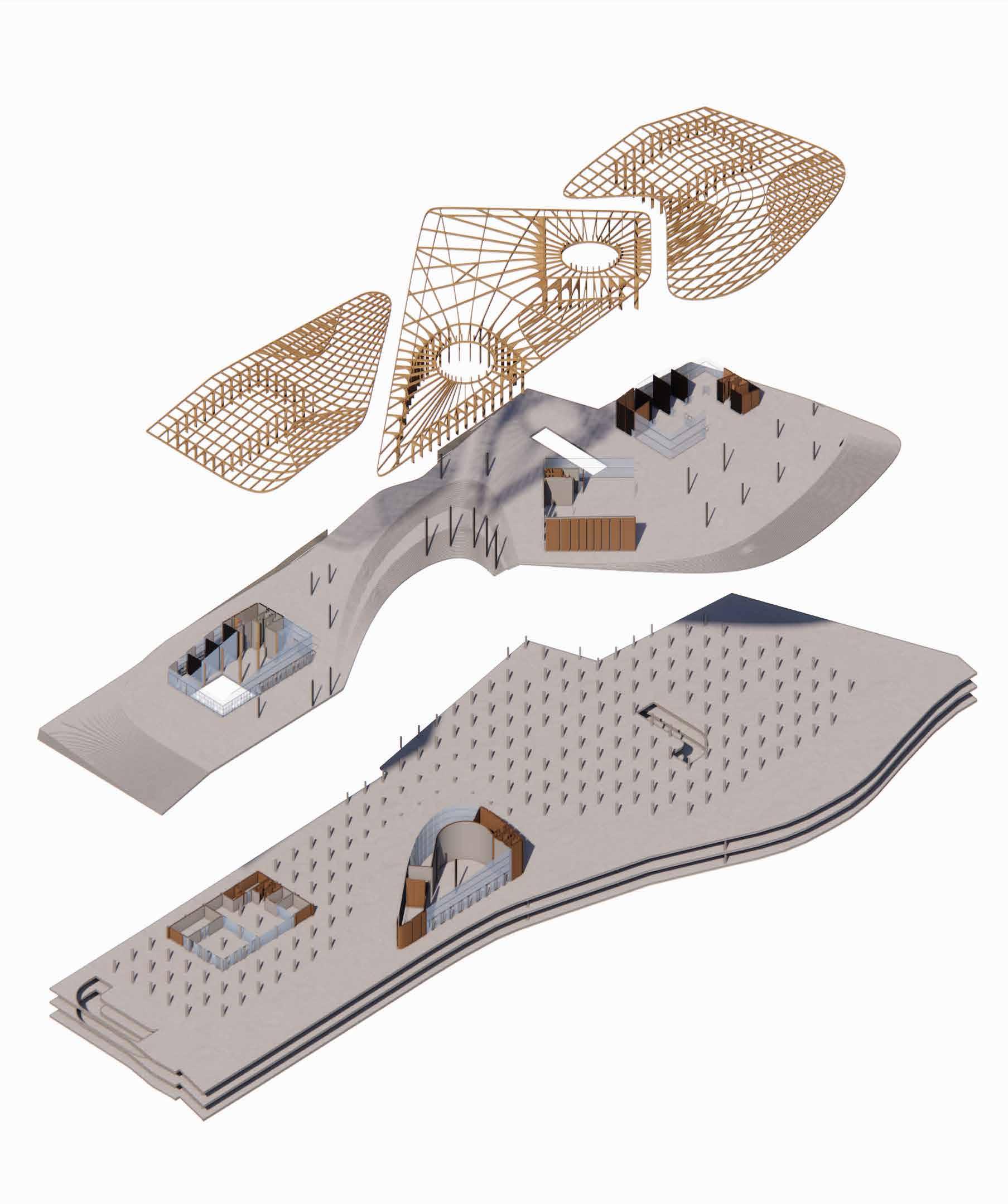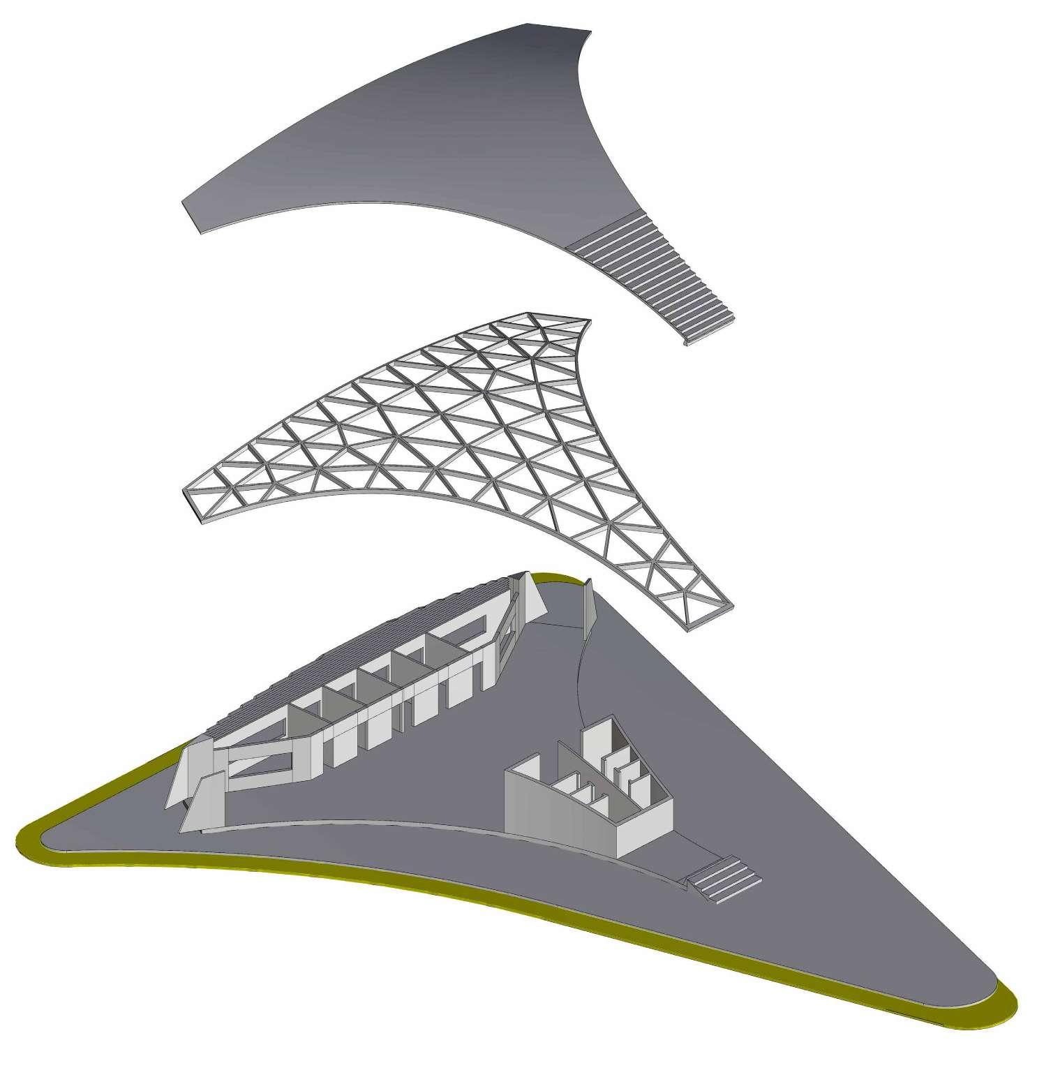 Roof, wall and floor spatial qualities which is derived from the midjourney - initial building speculations