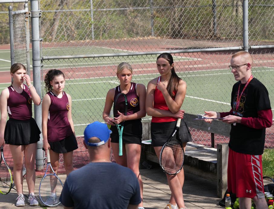 The girls tennis team meets with Coach James McDermott before a meet this spring. This year’s team featured four competitors, Ceceilia Elkjer, Ava Hastings, Caralyn Diamond and Olivia Schraut.