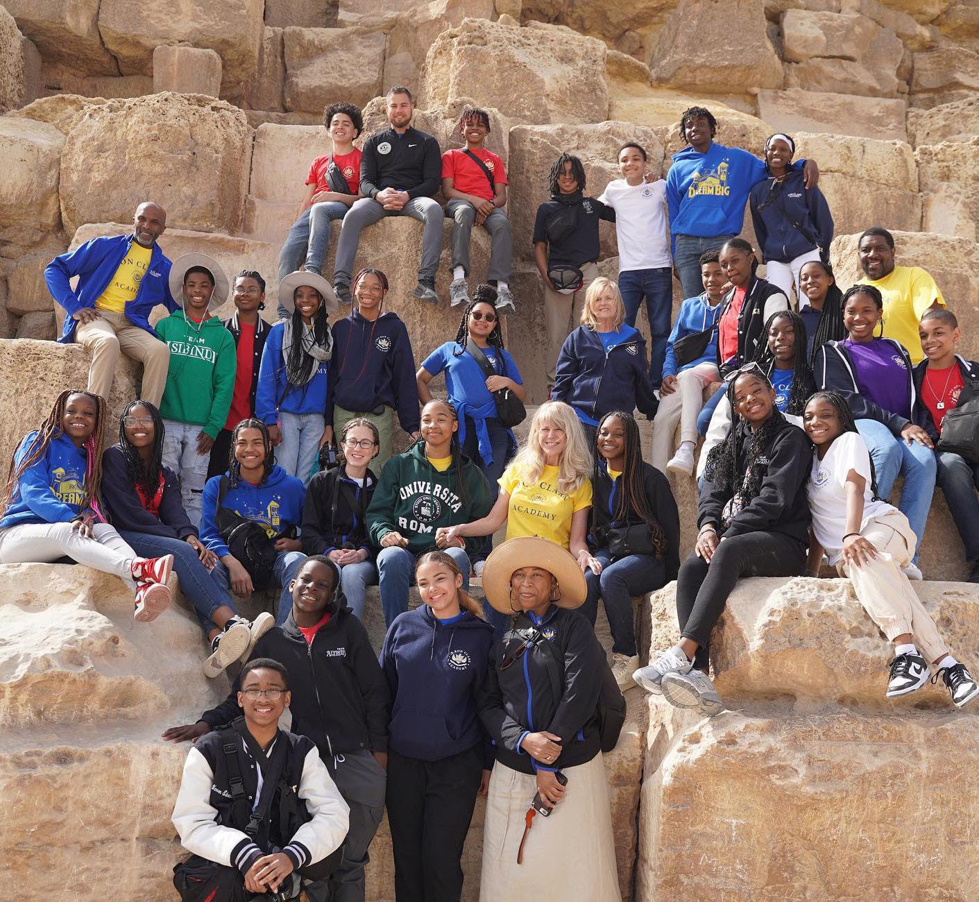 Students and staff stop for a photo on the Great Pyramid of Giza.