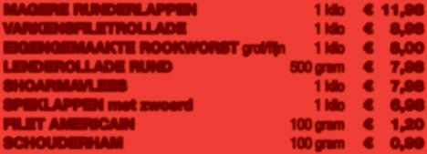 7 dagen per week, 365 dagen per jaar maken wij dé beste producten voor u klaar! Peppeltjes (klomp) heerlijke gezonde frikandellen NIEUW! 25% korting Lasagne of boerenlasagne 500 gram UIT EIGEN KEUKEN slechts 5 00 100 gram rosbief + 100 gram achterham + 1 bakje filet american ONTBIJTTIP slechts 5 75 MET EEN GOED GEVOEL GENIETEN VAN HEERLIJK VLEES UIT TWENTE Wintervinken 4 halen 3 betalen! VERS VLEES KALTER 1, 7481 LR HAAKSBERGEN WWW.SLAGERIJBROEKHUIS.NL Aanbiedingen geldig van 17-11 tot 23-11. Prijswijzigingen en drukfouten voorbehouden.