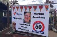 HAAKSBERGEN - Dat de trein van de MBS bij hem achter het huis langs rijdt, was afgelopen woensdagavond al raar. Dat er op de wagons ook nog twee servicebussen van Electro Breukers geparkeerd stonden, was helemaal een rare gewaarwording. Martijn Breukers voelde dat er iets gaande was op de dag dat hij Abraham zag. Maar dit sloeg alle verwachtingen. Via allerlei lijntjes was het gelukt MBS-vrijwilliger Frank Noordink te strikken om de jarige op deze ludieke wijze te verrassen. Werknemers van de jarige wilden Martijn eens goed in het zonnetje zetten, ook al denderde de hagel uit de lucht aan de Geukerdijk waar de locomotief bij huize Breukers halt hield. ”Waarom hier zoveel mensen rond het huis lopen? Tja, ik ben 50 geworden. Och jee! Kijk dan! Onze bussen staan op de trein.” Toen viel het kwartje echt. De vuurkorf deed z’n werk, de koelkast in de schuur idem en het bleef die woensdagavond nog lang onrustig in het bos aan Geukerdijk. (Foto's RTV Sternet)