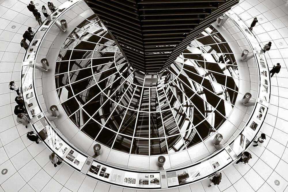De koepel symboliseert transparantie en openheid van de regering. Hij staat voor de Duitse hereniging en weerspiegelt de waarden waarop het land is gebouwd. Direct boven de grote centrale ruimte — de plenaire zaal — vormt de koepel een bewuste verwijzing naar het toezicht van het volk op de regering. Staande bij de informatiekring rond de spiegelzuil keek ik naar beneden, de diepte in. En nee, je valt niet! Je kunt er gewoon recht naar beneden kijken, rechtstreeks op de regering terwijl ze debatteren. Dit is één van mijn kleurenfoto’s die ik daar heb gemaakt en in Photoshop heb omgezet naar zwart-wit."