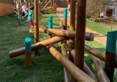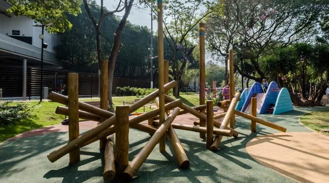 Um exemplo é a Árvore Bambu, concebida a partir de três árvores condenadas, transformando-se em um equipamento lúdico pela fusão entre a organicidade de seus troncos e a atividade de brincar. Os troncos, mantendo seus formatos originais, foram estrategicamente posicionados e encaixados para criar uma imponente escultura no espaço de brincar. Mediante análises de viabilidade, estruturação e aspectos lúdicos, os espaços de recreação foram meticulosamente planejados nos vãos dos troncos, alinhando-se às normas de segurança e conferindo uma autenticidade natural aos brinquedos. O resultado é um equipamento seguro, lúdico e intrinsecamente ligado à natureza.