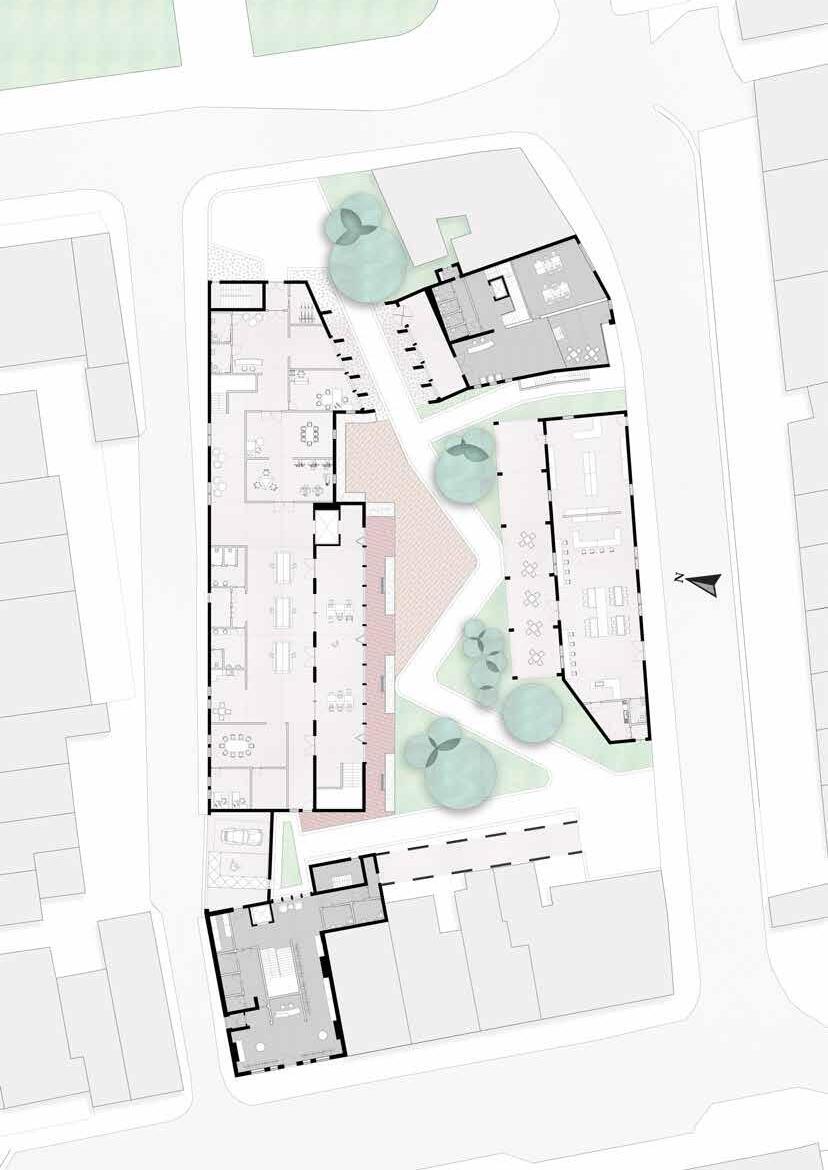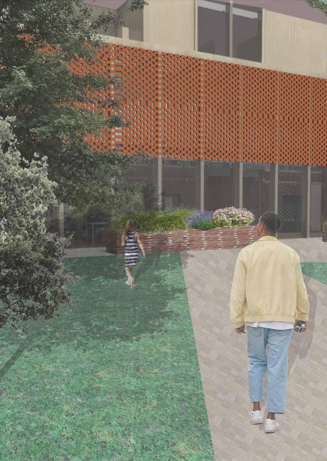 An arched walkway forms a barrier between the open green space and the rear part of the existing shop lots along Lancaster Rd. Such an intervention echoes the design of the listed Miller Arcade nearby. Its brick build-up creates a continuation from the old to the new.