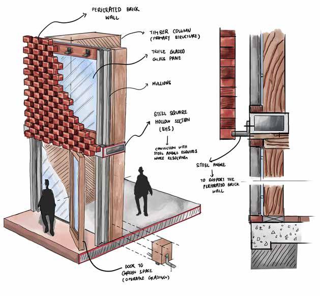 The double glazed window allows daylighting from the atrium into the interior space, and they are bottom-hung sashes meaning they are openable to provide natural ventilation into the space. The timber finish of the window frame juxtaposes a stark contrast to the heavy use of brick and stone of the structure. The timber window frame is chosen for its sustainability and low embodied energy. The cill protects the structural integrity by keeping out the damp which can degrade the timber frame.