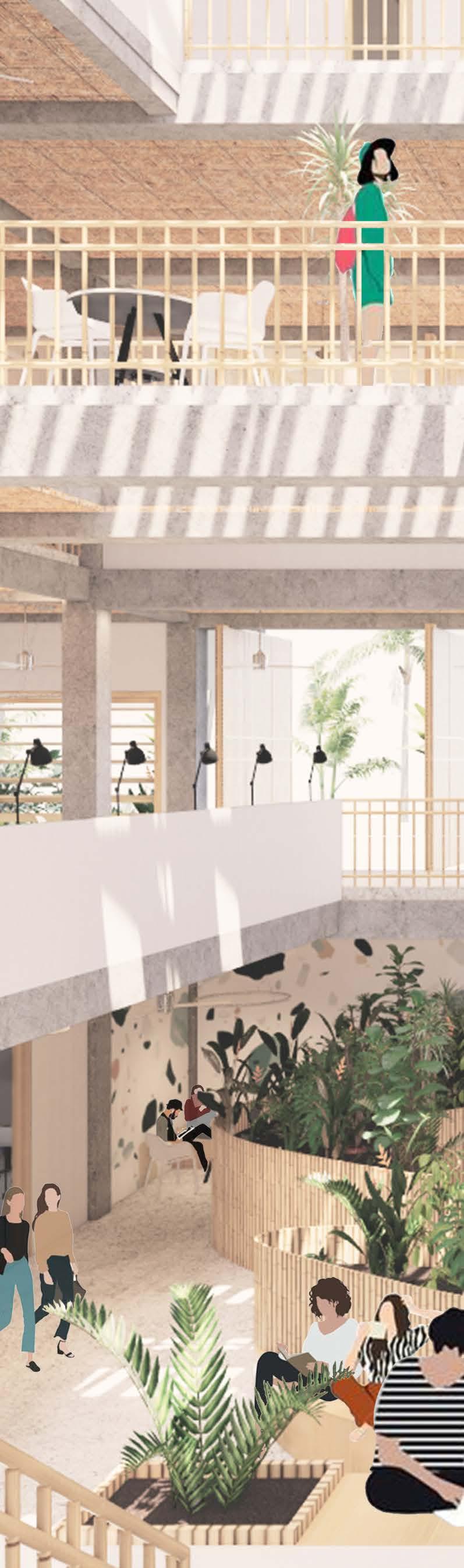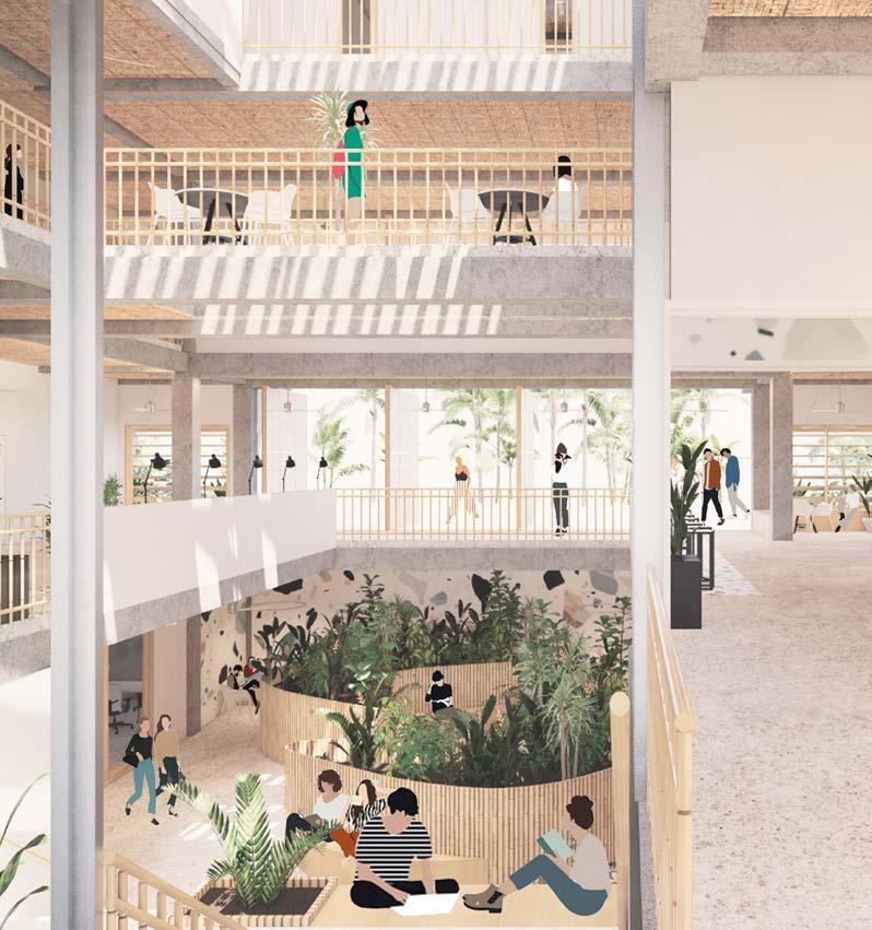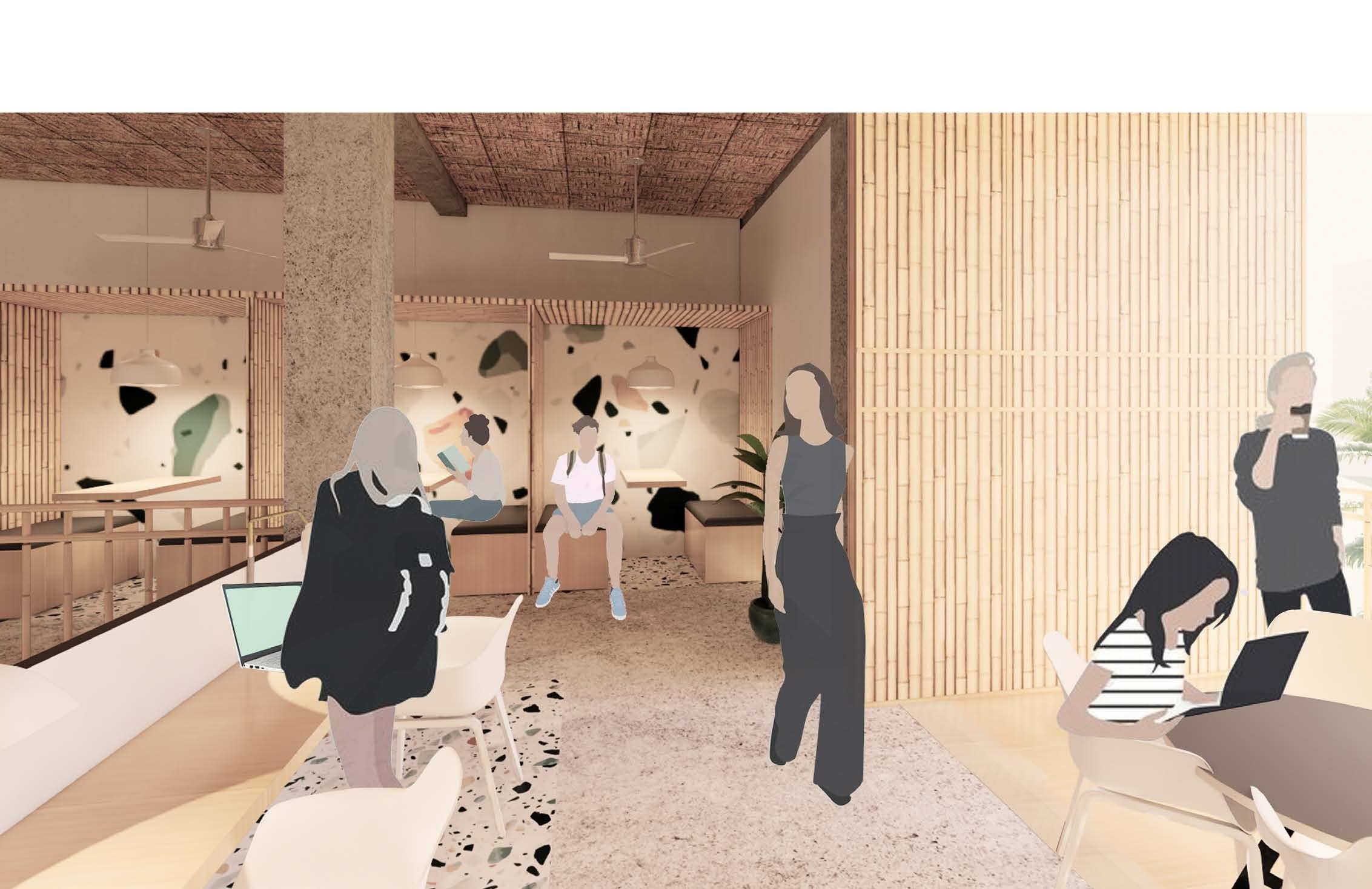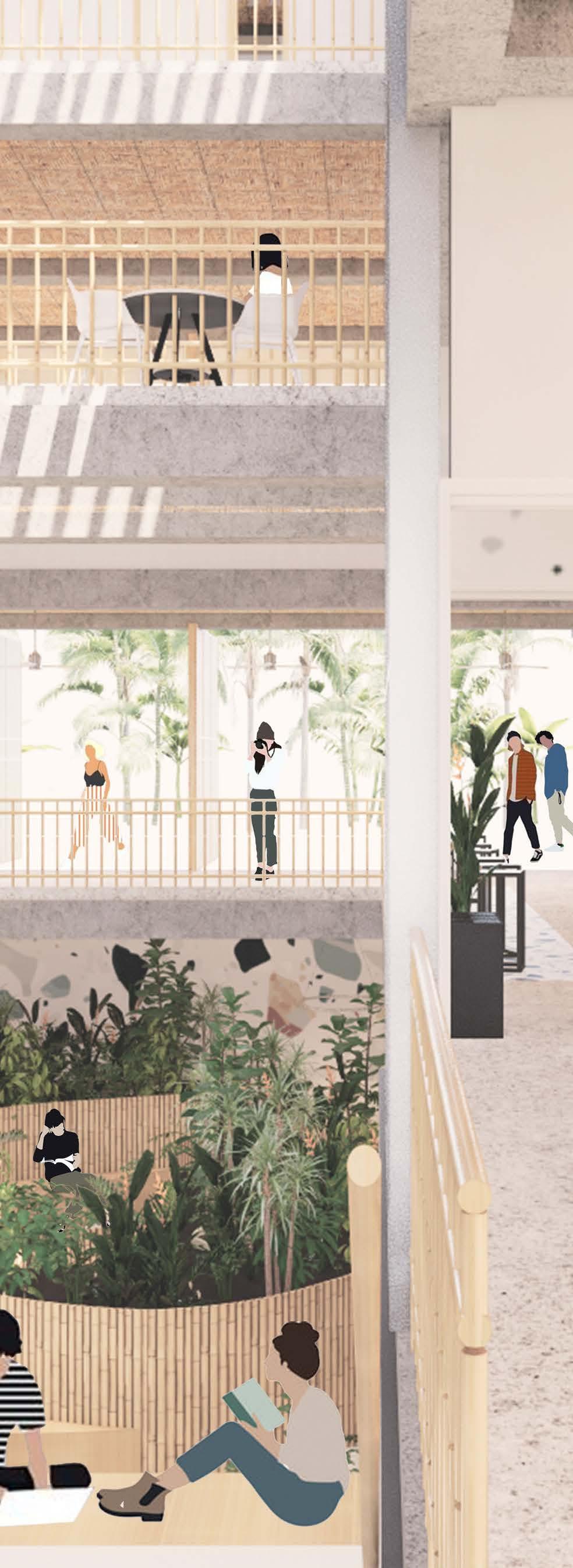 Throughout the faculty, diverse study spaces are offered, with terrazzo zoning in the naturally ventilated areas. This design ensures effective functionality during a pandemic by supporting airflow and adaptable seating for social distancing.