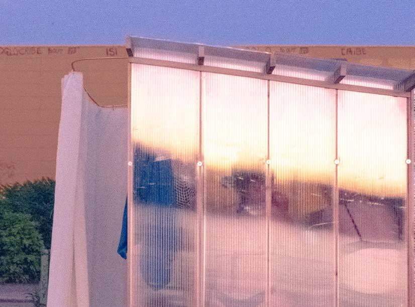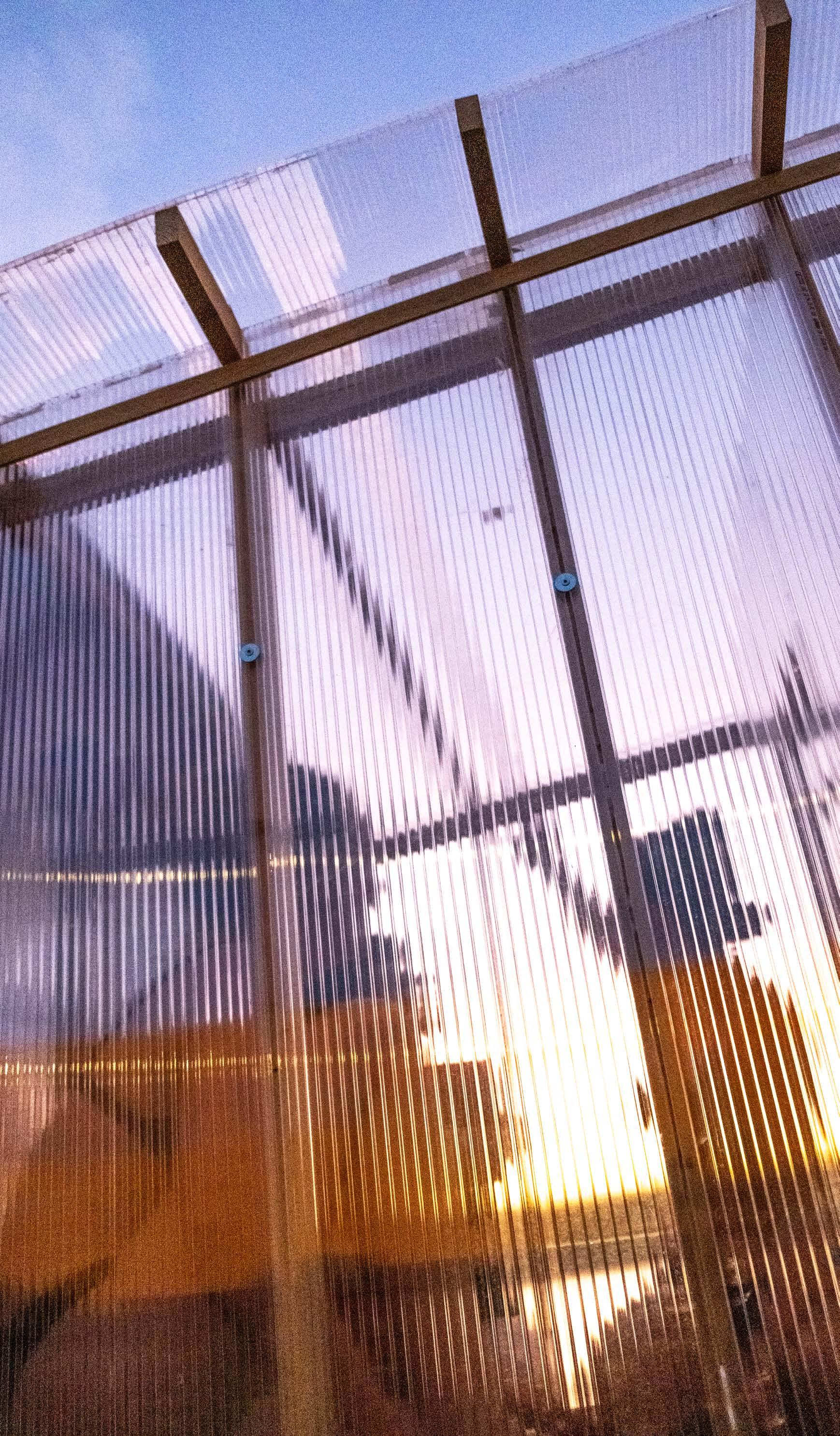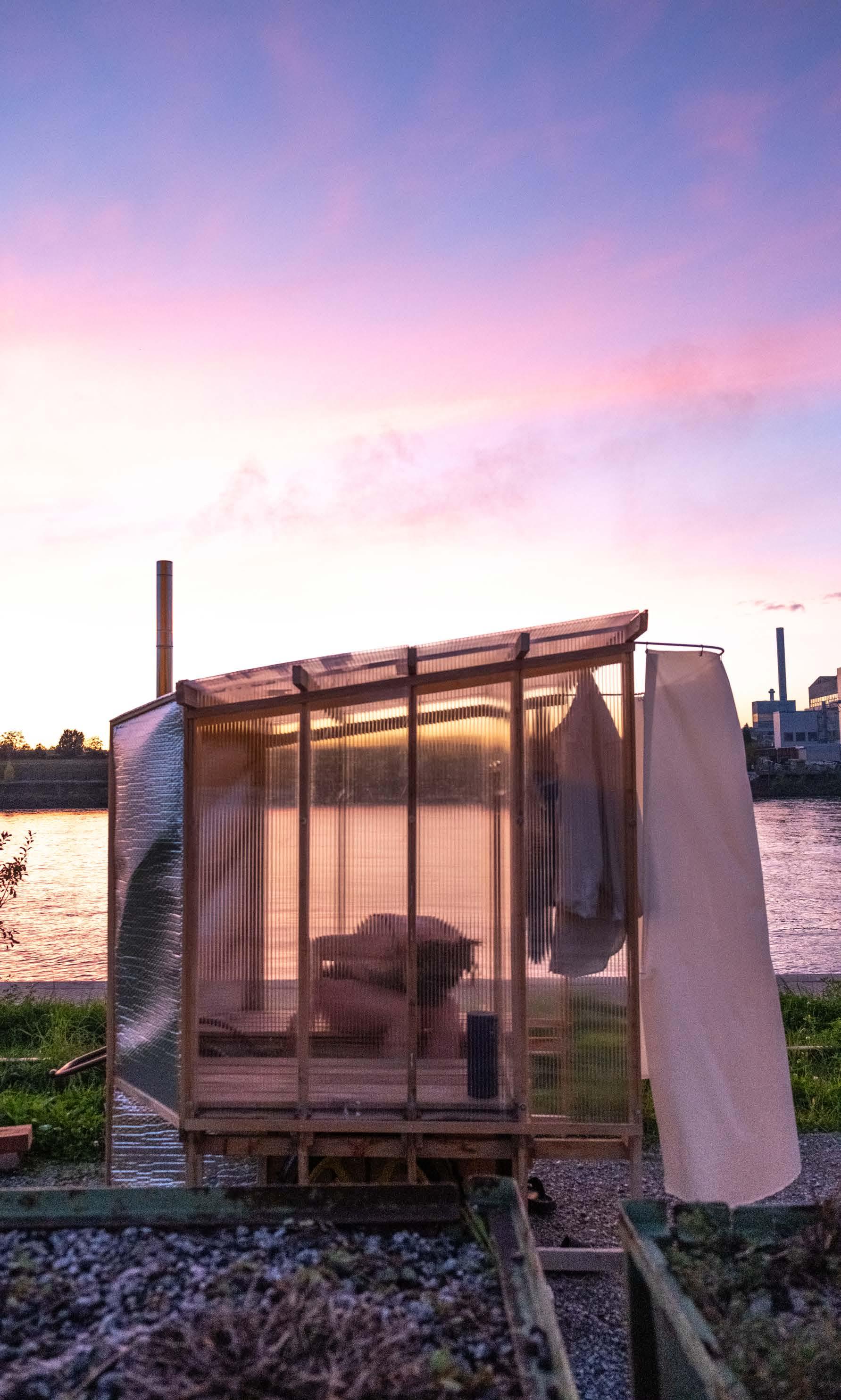 The sauna’s walls, crafted from reused polycarbonate, are secured with metal plates that hold the panels in place without penetrating the material, exemplifying a thoughtful design for disassembly.