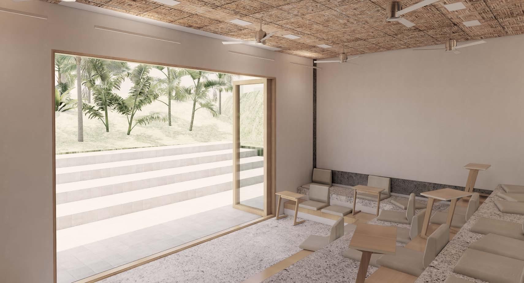 The building is supported by base isolators, which protect the structure from earthquake damage. A protective facade, crafted from locally sourced bamboo, regulates the indoor climate while also shielding windows during hurricanes.