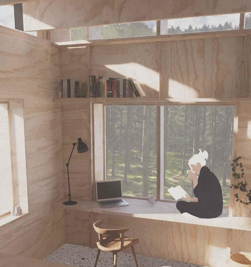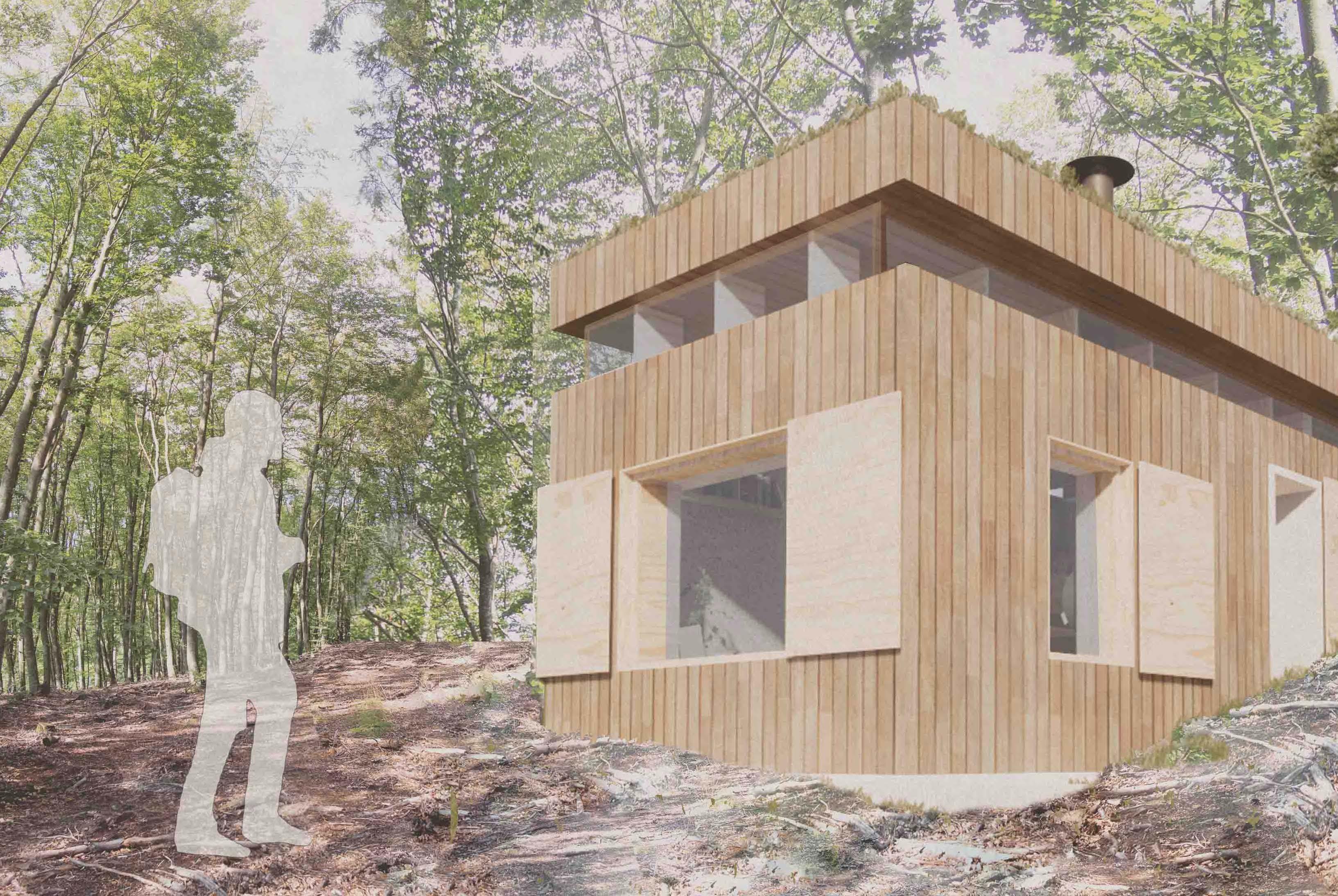 Off-grid cabin in the woods working with passive and active solutions, genius loci and the human sense of vision, touch, and movement.