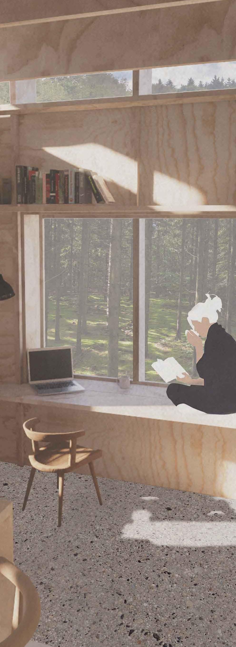 Located in Vodskov, Denmark, nearby one of the lakes, tugged in between two pathways and into the slope of the hill, one finds this small cabin. The cabin functions as a writer’s retreat, where the writer can pull away from the noise of everyday life and focus of the nature with an undisturbed view of the forest through the window over the desk. A smaller excavation of the hill makes space for two concrete walls to lay the backbone of the cabin, while the main body is constructed in wood.