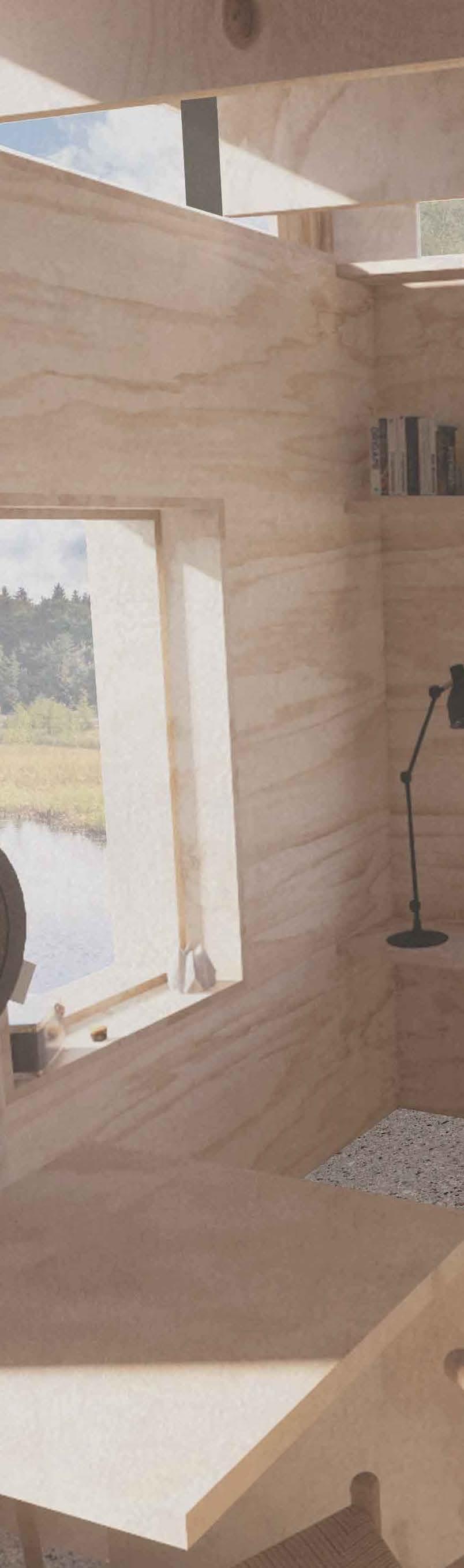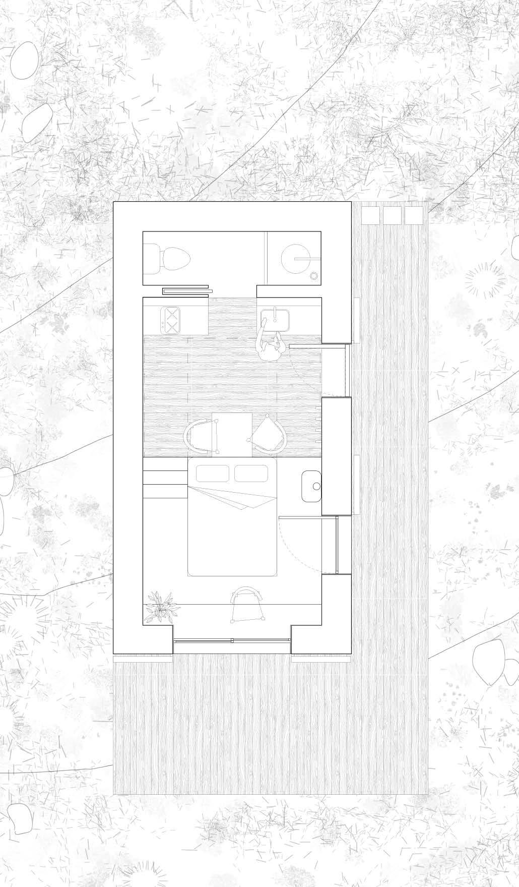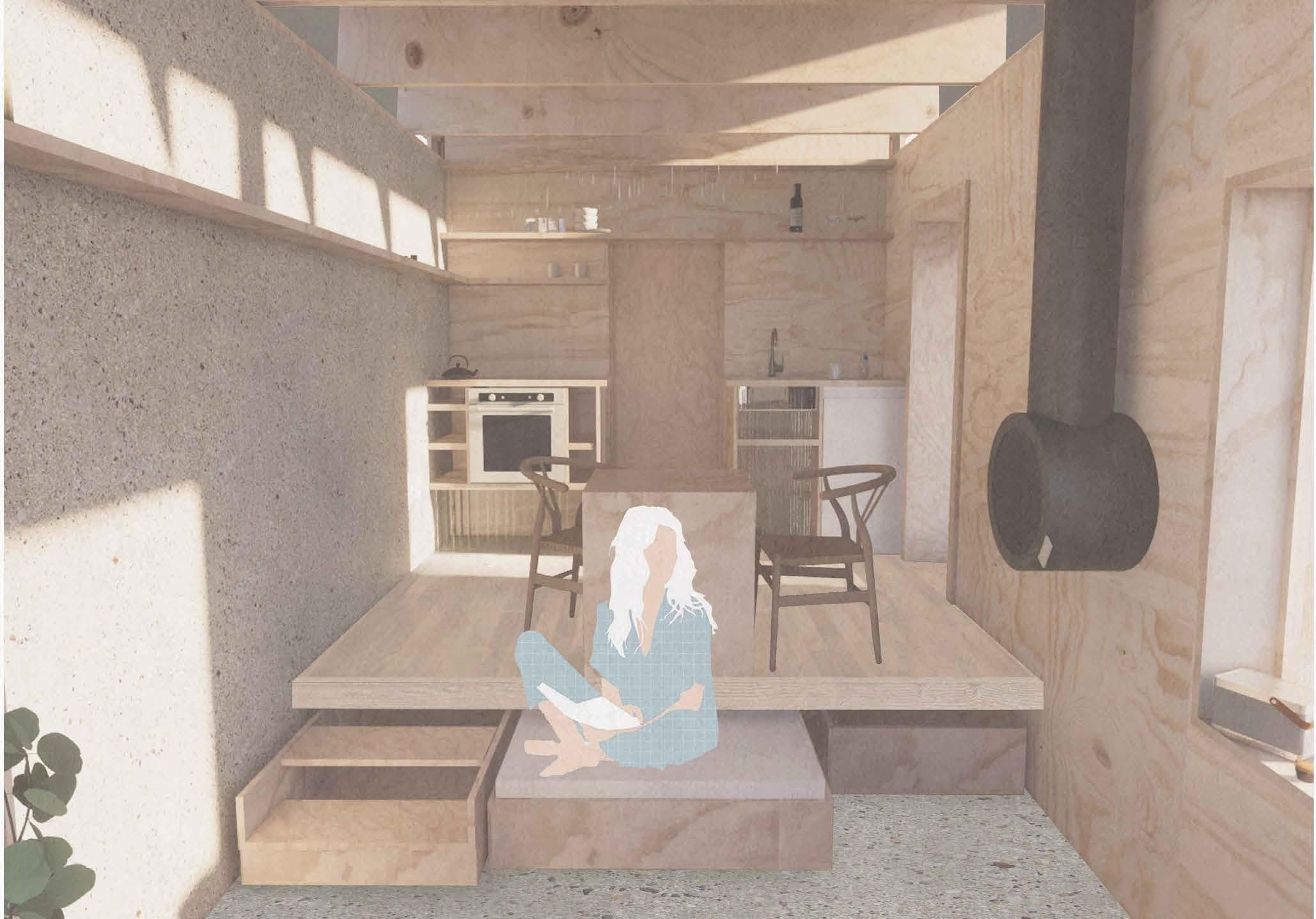 This main body is a furniture, where the occupant is offered different niches to retreat and occupy for whatever purpose they see fit. In that way the retreat relates both practically and poetically to the place it is situated, responding to the genius loci, and addressing the human sense of vision, touch, and movement.