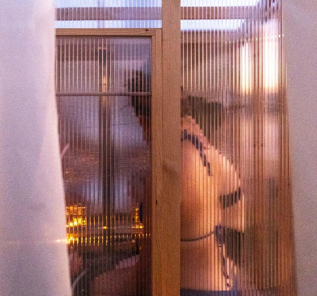With semi-translucent polycarbonate walls, the sauna offers glimpses of movement within—suggesting activity but preserving a sense of privacy. From inside, users can look out, letting the colors and light of the surroundings filter softly through the walls, connecting the interior to its setting.