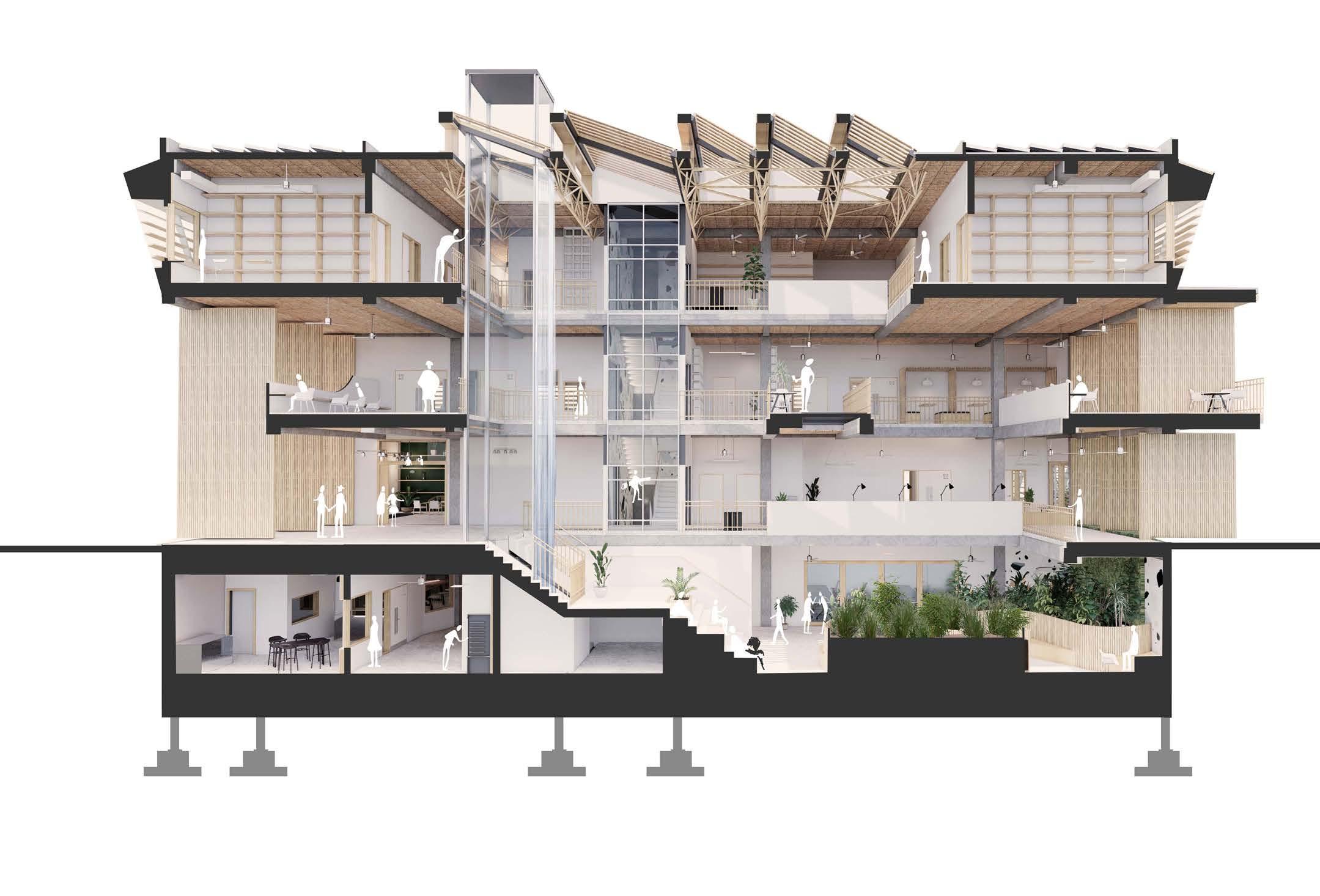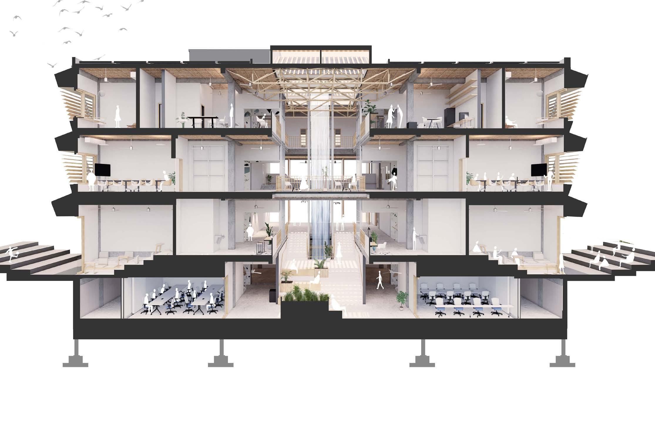 section of the building highlights the clear view through structure. Offices and classrooms are mechanically ventilated, while the rest of the building takes advantage thermal buoyancy, enabled by the large open atrium skylight supported by parametrically optimized trusses.