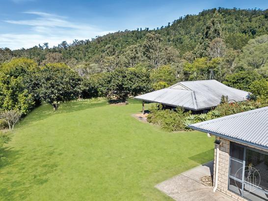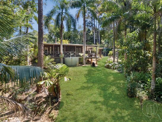 Elevated on the hill, a charming one-bedroom cottagestyle shed home offers cathedral ceilings, timber-look flooring, an open-plan kitchen with island bench, stainless appliances and RC/AC. The bedroom opens to a covered veranda leading to a timber deck framed by palms and ferns. A separate bathroom, 23,000L water tank, single carport and three-phase power add convenience.