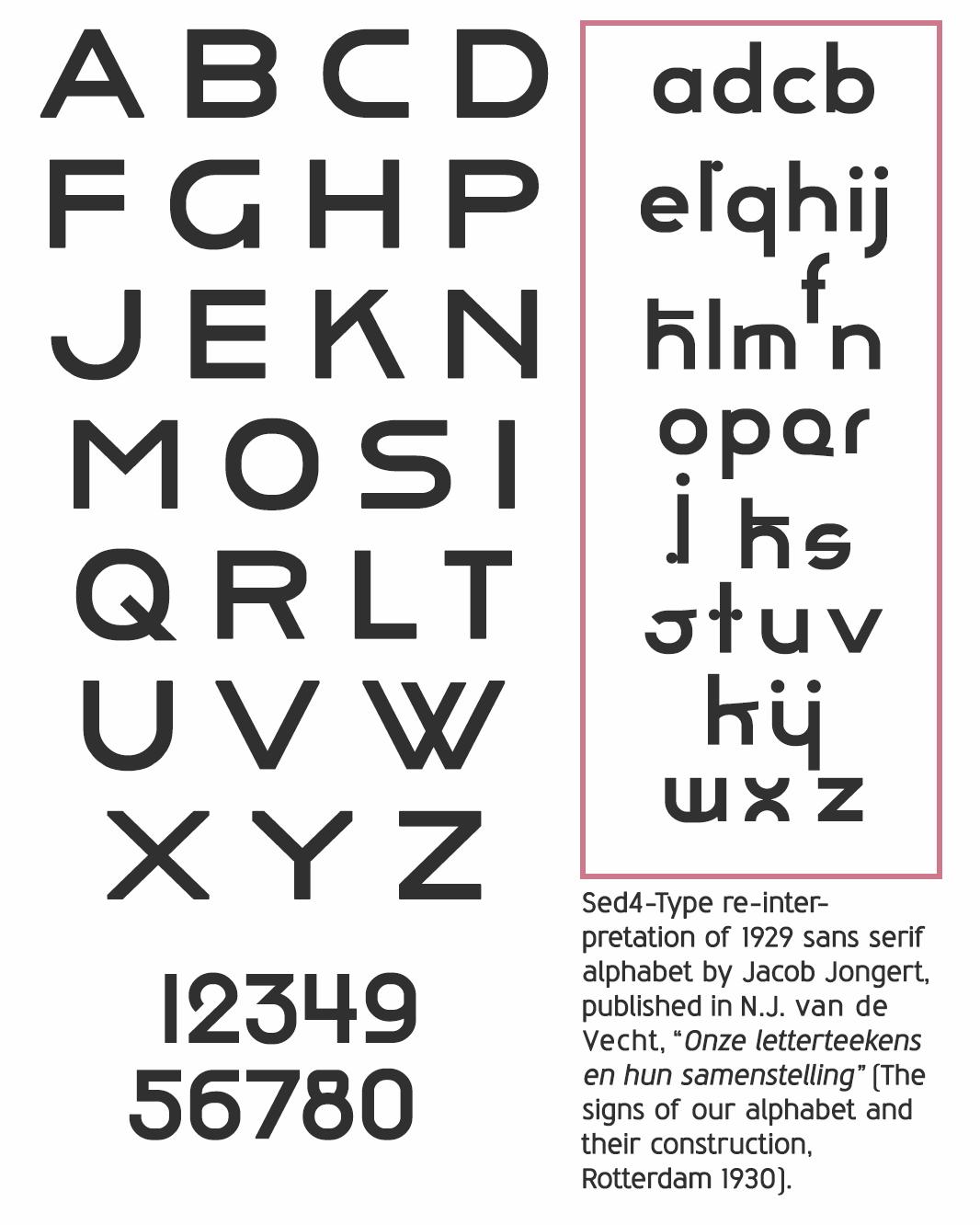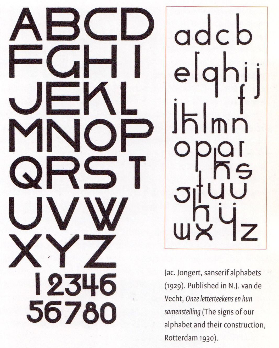 A re-interpretation of the 1926 geometric sans serif alphabet system reproduction by Jacob Jongert, published in a 1930 sourcebook by N.J. van de Vecht. The geometric uppercase set of the alphabet system is what would later become the famous sans serif capitals which he used for lettering throughout many of his Van Nelle materials.
