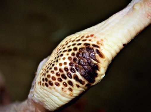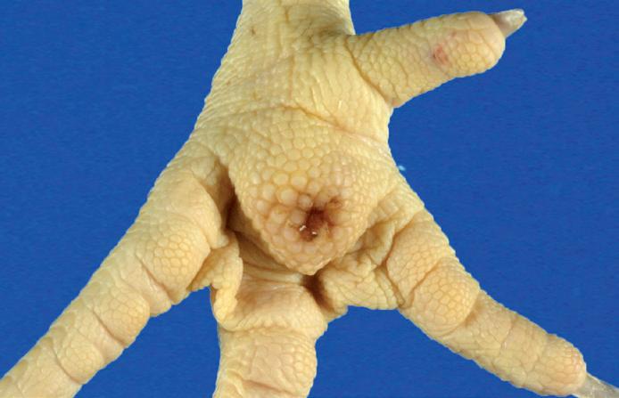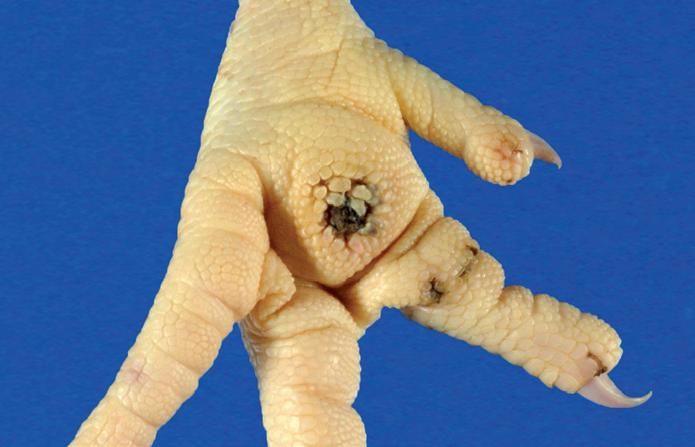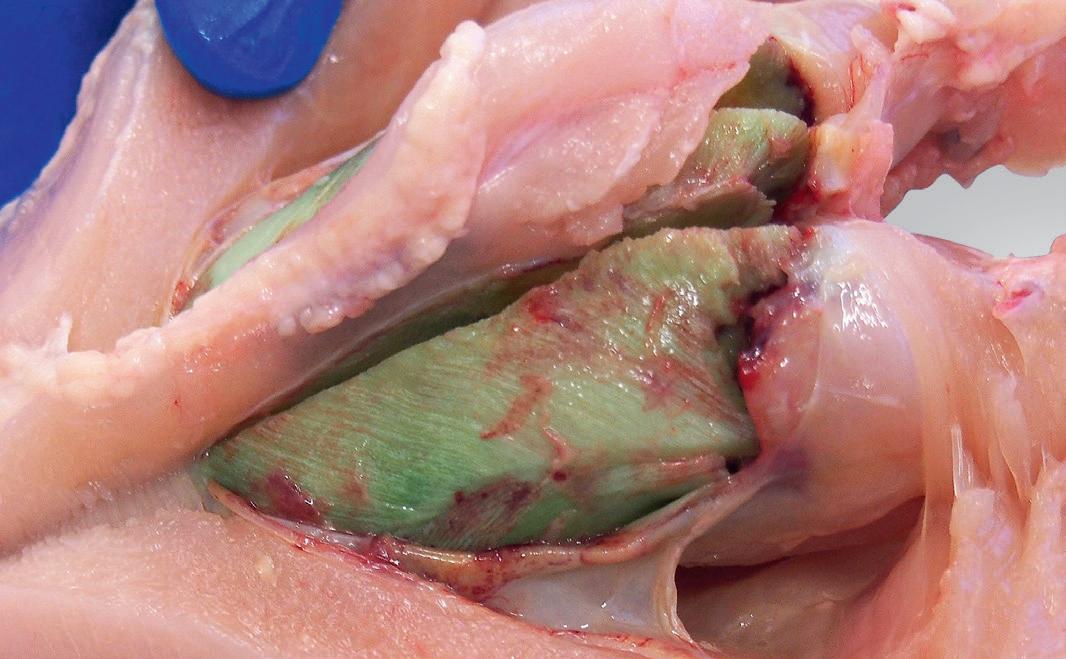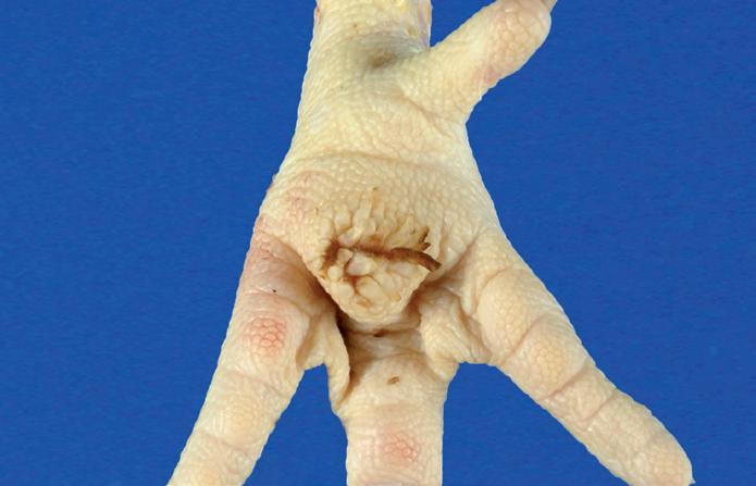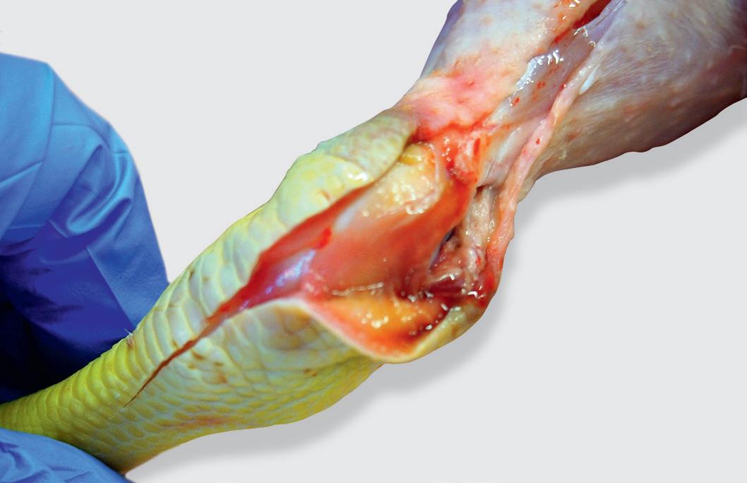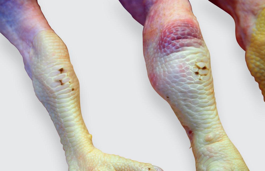 Inflammation of the Achilles tendon/tendon sheath (Reo-virus) enhanced by bacterial infection. Swollen, warm and painful tendon. Bruises, skin irritation and hock burn develop. Often on both legs. In that case, the entire carcass and the organs must be rejected.