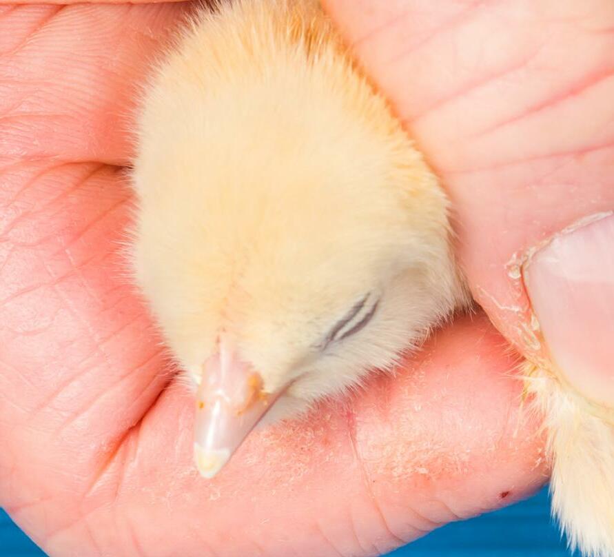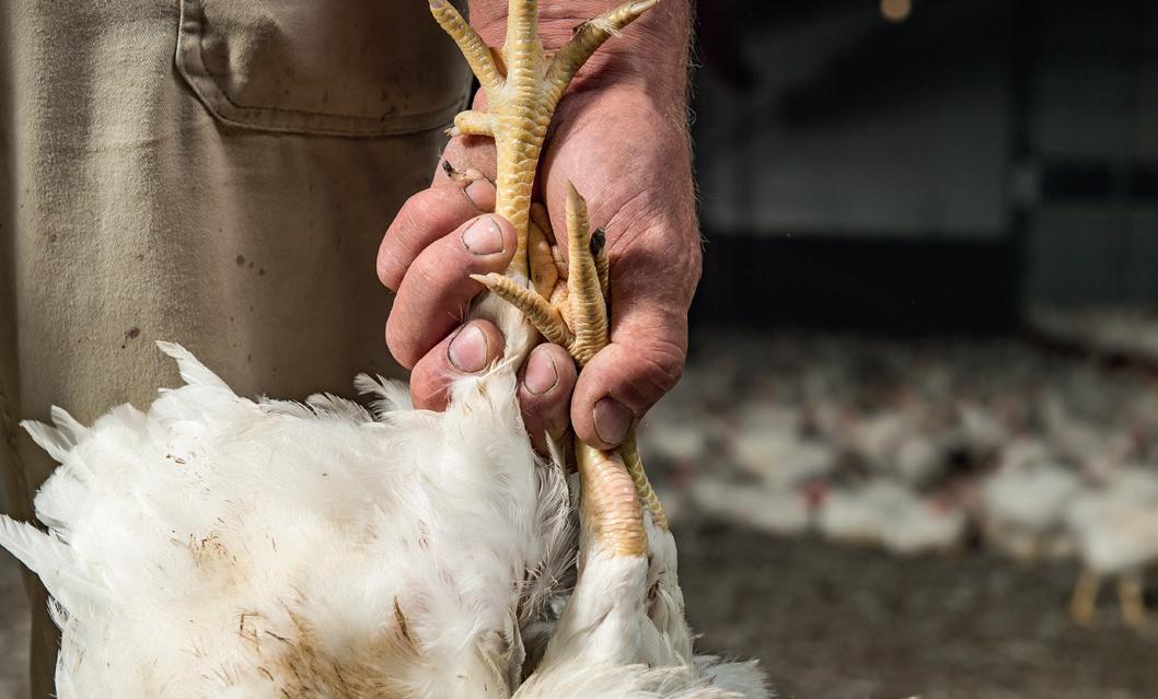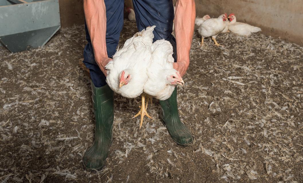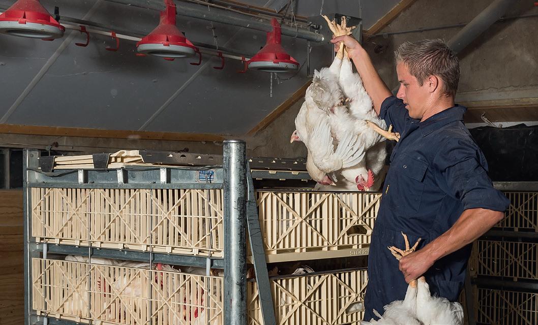 Hip haematomas occur mainly when you lift broilers too high. You then have the tendency to twist your wrists and the bird’s leg. So lift your arm up high enough, like this.