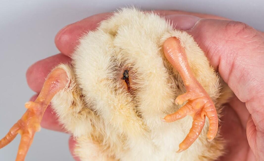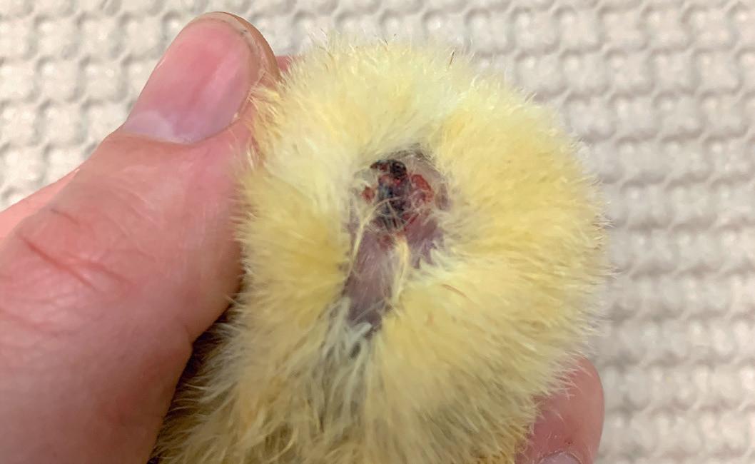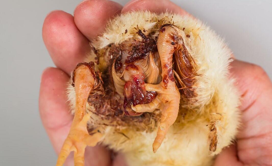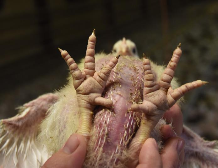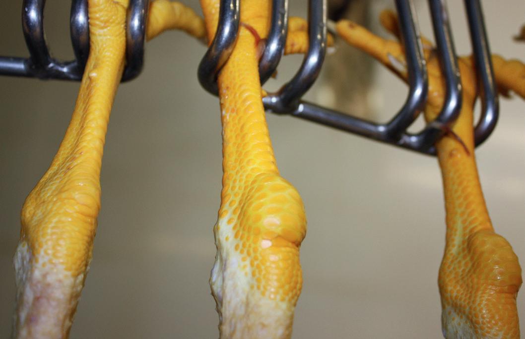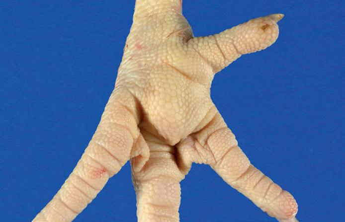 Resembles perosis. One or both legs are turned outward. The hatching process might be the cause, but it can also occur later, especially in young chicks not moving enough. Birds can’t move and often die from malnutrition. No reason to reject the leg or the whole carcass.