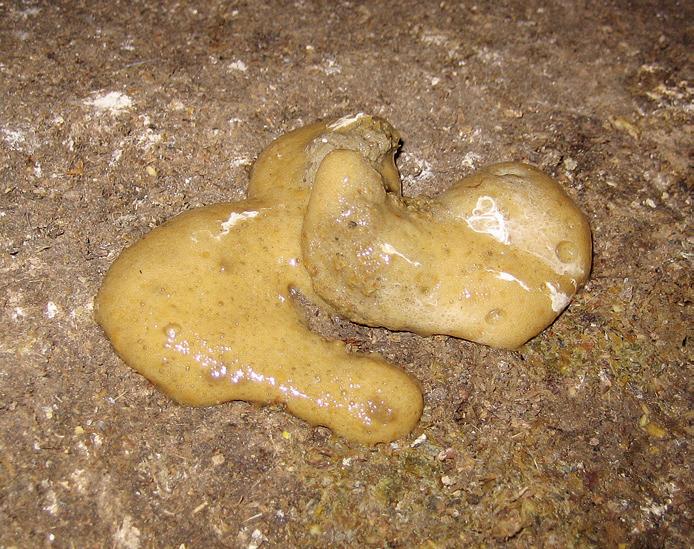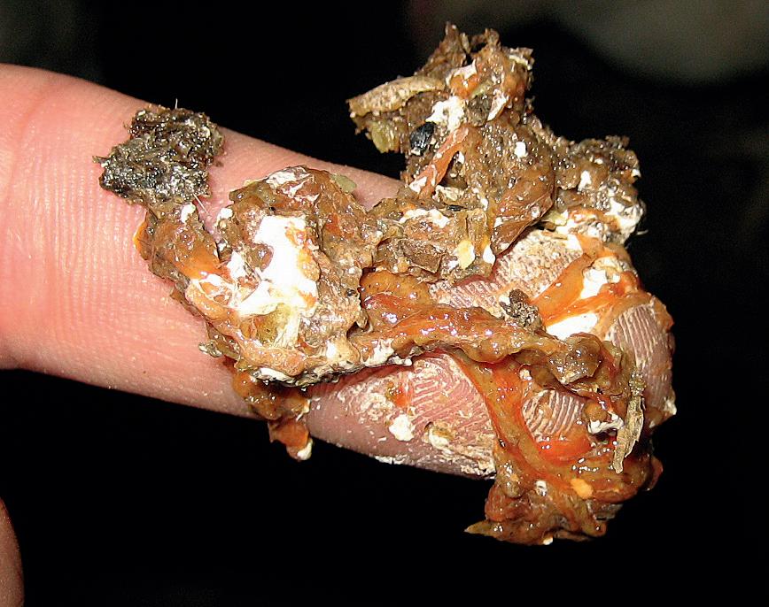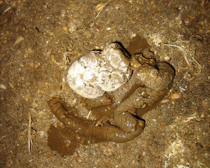 You can even see maize in this very poorly digested dropping; normally this is the most easily digestible ingredient of chicken feed.