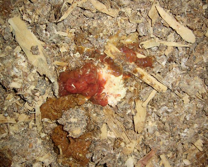 The brown caecal droppings, which are usually smooth and creamy, are produced when the caecum is emptied. The colour in itself doesn’t say much, but it should not be foamy.