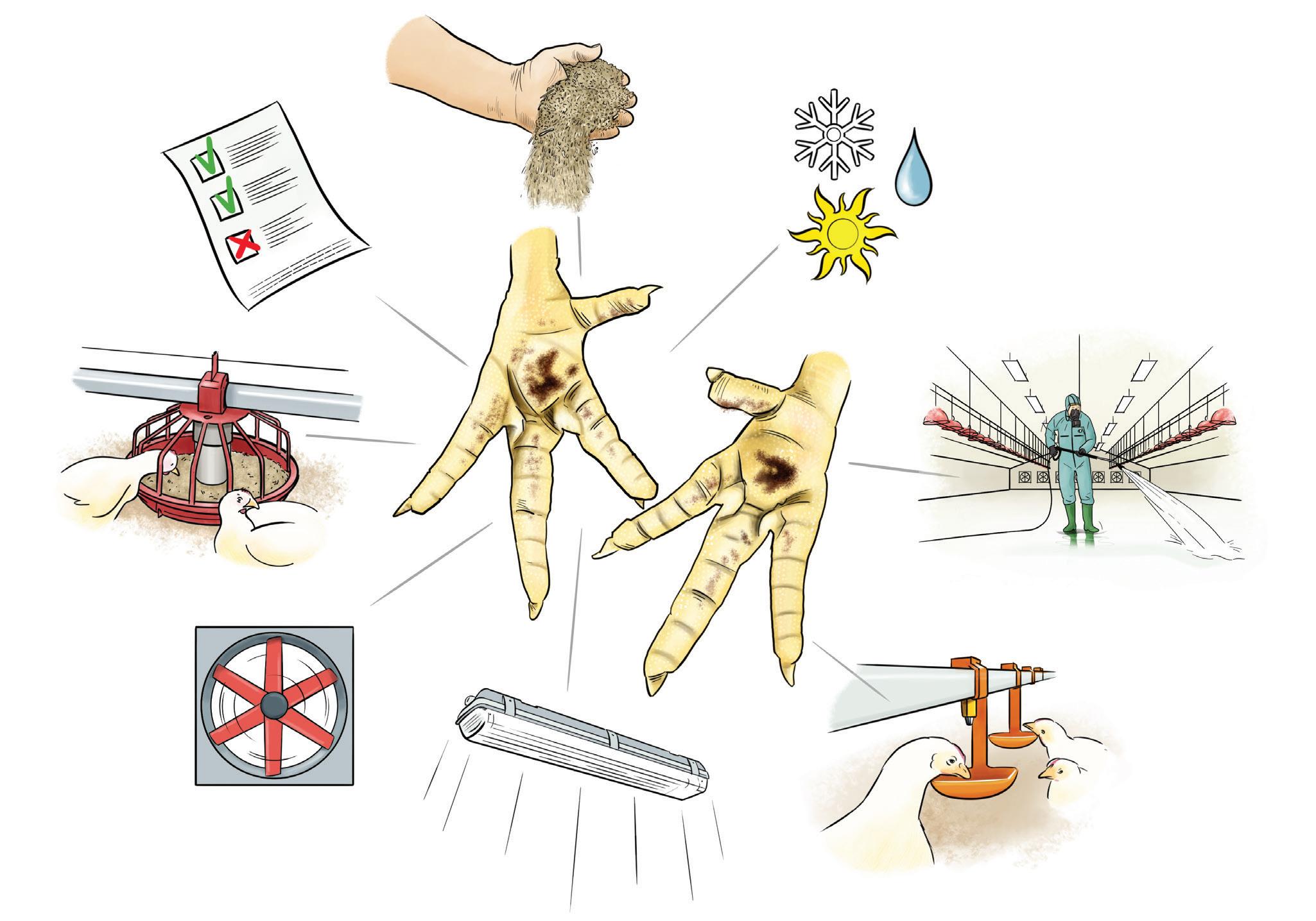 The causes of leg disorders are pathogens, nutritional or management problems. Because of these disorders, broilers have difficulty walking, so they eat and drink less and fall behind in growth, thus causing poor uniformity. They are also inclined to sit on their breast, causing litter spots, bruising, breast blisters.