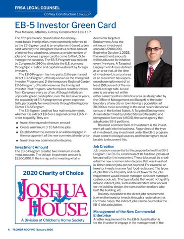 EB-5 Investor Green Card Paul Messina, Attorney, Cotney Construction Law, LLP The fifth preference classification for employment-based immigration, more commonly referred to as the EB-5 green card, is an employment-based green card, whereby the immigrant invests a certain amount of money into a business, creates a certain number of jobs and receives a green card to come to the U.S. to manage the business. The EB-5 Program was created by Congress in 1990 to stimulate the U.S. economy through job creation and capital investment by foreign investors. The EB-5 Program has two parts: 1) the permanent Direct EB-5 Program, officially known as the Immigrant Investor Program and 2) the temporary Regional Center EB-5 Program, officially known as the Immigrant Investor Pilot Program, which requires reauthorization from Congress every so often. Although initially an unpopular green card option, over the last several years, the popularity of EB-5 program has grown exponentially, particularly for investments through the Regional Center EB-5 Program. The EB-5 green card has four main requirements, whether it is a direct EB-5 or a regional center EB-5, in order to qualify. They are: ■ Invest the required minimum amount ■ Create a minimum of 10 full-time jobs ■ Establish that the investor is or will be engaged in the management of the new commercial enterprise ■ Invest in a new commercial enterprise.