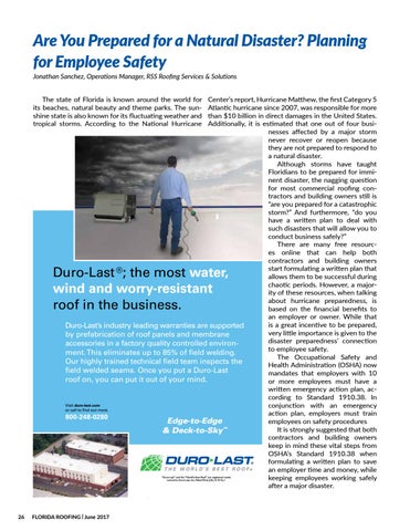 Center’s report, Hurricane Matthew, the first Category 5 Atlantic hurricane since 2007, was responsible for more than $10 billion in direct damages in the United States. Additionally, it is estimated that one out of four busiWaterwind_HP-FRSA.qxp 10/6/15 3:50 PM Page 1 nesses affected by a major storm never recover or reopen because they are not prepared to respond to a natural disaster. Although storms have taught Floridians to be prepared for imminent disaster, the nagging question for most commercial roofing contractors and building owners still is “are you prepared for a catastrophic storm?” And furthermore, “do you have a written plan to deal with such disasters that will allow you to conduct business safely?” There are many free resources online that can help both contractors and building owners start formulating a written plan that ® allows them to be successful during chaotic periods. However, a majority of these resources, when talking about hurricane preparedness, is based on the financial benefits to an employer or owner. While that is a great incentive to be prepared, Duro-Last’s industry leading warranties are supported very little importance is given to the by prefabrication of roof panels and membrane disaster preparedness’ connection accessories in a factory quality controlled environto employee safety. ment. This eliminates up to 85% of field welding. The Occupational Safety and Our highly trained technical field team inspects the Health Administration (OSHA) now field welded seams. Once you put a Duro-Last mandates that employers with 10 roof on, you can put it out of your mind. or more employees must have a written emergency action plan, according to Standard 1910.38. In Visit duro-last.com conjunction with an emergency or call to find out more. action plan, employers must train 800-248-0280 Edge-to-Edge employees on safety procedures It is strongly suggested that both & Deck-to-Sky™ contractors and building owners keep in mind these vital steps from OSHA’s Standard 1910.38 when formulating a written plan to save an employer time and money, while keeping employees working safely after a major disaster.