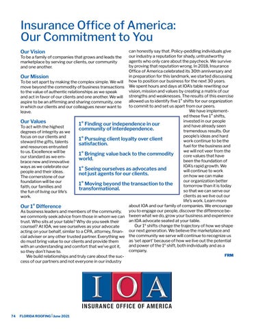 Insurance Office of America: Our Commitment to You can honestly say that. Policy-peddling individuals give our industry a reputation for shady, untrustworthy To be a family of companies that grows and leads the agents who only care about the paycheck. We survive marketplace by serving our clients, our community by proving that reputation wrong. In 2018, Insurance and one another. Office of America celebrated its 30th anniversary and in preparation for this landmark, we started discussing Our Mission To be set apart by making the complex simple. We will how to position our business for the next 30 years. move beyond the commodity of business transactions We spent hours and days at IOA’s table rewriting our vision, mission and values by creating a matrix of our to the value of authentic relationships as we speak and act in favor of our clients and one another. We will strengths and weaknesses. The results of this exercise allowed us to identify five 1° shifts for our organization aspire to be an affirming and sharing community, one to commit to and set us apart from our peers. in which our clients and our colleagues never want to We have implementleave. ed these five 1° shifts, invested in our people Our Values 1° Finding our independence in our and have already seen To act with the highest community of interdependence. tremendous results. Our degrees of integrity as we people’s ideas and hard focus on our clients and 1° Pursuing client loyalty over client work continue to be the steward the gifts, talents satisfaction. fuel for the business and and resources entrusted we will not veer from the to us. Excellence will be 1° Bringing value back to the commodity core values that have our standard as we emworld. been the foundation of brace new and innovative IOA’s rapid growth. We ways as we celebrate our 1° Seeing ourselves as advocates and will continue to work people and their ideas. not just agents for our clients. on how we can make The cornerstone of our our organization better foundation will be our 1° Moving beyond the transaction to the tomorrow than it is today faith, our families and transformational. so that we can serve our the fun of living our life’s clients as we live out our work. life’s work. Learn more about IOA and our family of companies. We encourage Our 1° Difference you to engage our people, discover the difference beAs business leaders and members of the community, tween what we do, grow your business and experience we commonly seek advice from those in whom we can an IOA advocate seated at your table. trust. Who sits at your table? Why do you seek their Our 1º shifts change the trajectory of how we shape counsel? At IOA, we see ourselves as your advocate our next generation. We believe the marketplace and acting on your behalf, similar to a CPA, attorney, finanthe community we serve will continue to recognize us cial adviser or any other trusted partner. Everything we as ‘set apart’ because of how we live out the potential do must bring value to our clients and provide them and power of the 1º shift, both individually and as a with an understanding and comfort that we’ve got it, company. so they don’t have to. FRM We build relationships and truly care about the success of our partners and not everyone in our industry