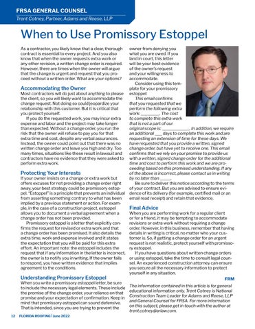 When you are performing work for a regular client or for a friend, it may be tempting to accommodate revisions or extra work without requiring a change order. However, in this business, remember that having details in writing is critical, no matter who your customer is. So, if getting a change order for an urgent request is not realistic, protect yourself with promissory estoppel. If you have questions about written change orders or using estoppel, take the time to consult legal counsel. An experienced construction attorney can ensure you secure all the necessary information to protect yourself in any situation. FRM The information contained in this article is for general educational information only. Trent Cotney is National Construction Team Leader for Adams and Reese, LLP and General Counsel for FRSA. For more information on this subject, please get in touch with the author at trent.cotney@arlaw.com.