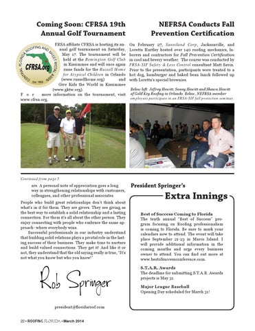 Extra Innings Best of Success Coming to Florida The tenth annual “Best of Success” program focusing on Roofing professionalism is coming to Florida. Be sure to mark your calendars now to attend. The event will take place September 21-23 in Marco Island. I will provide additional information in the coming months and urge every business owner to attend. You can find out more at www.bestofsuccessconference.com. S.T.A.R. Awards The deadline for submitting S.T.A.R. Awards projects is May 31. Major League Baseball Opening Day scheduled for March 31!