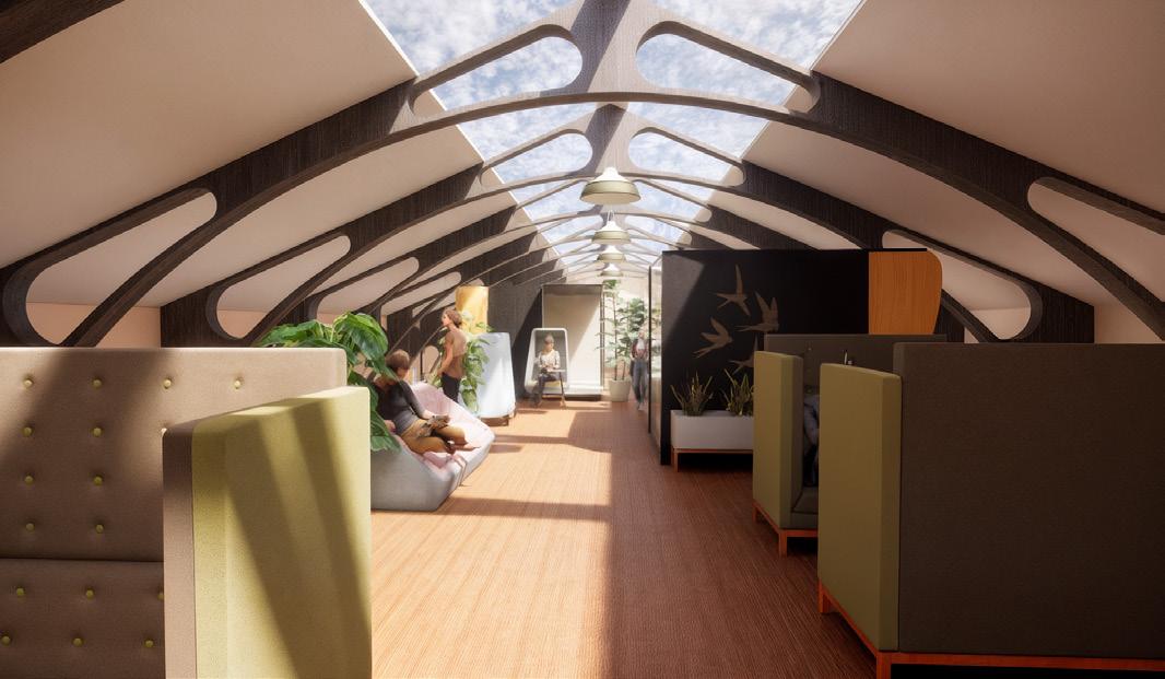 Wilkins, M, (2025). Visual of Quiet Space Showing Bespoke Organic Element, Pods and Mezzanine Above. [Unpublished]