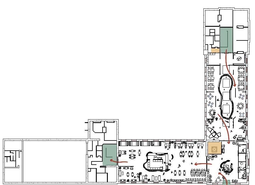 Wilkins, M, (2025). Colour contrasting, tactile wayfinding pathway on the floor of the mezzanine to guide people to each space. [Unpublished]
